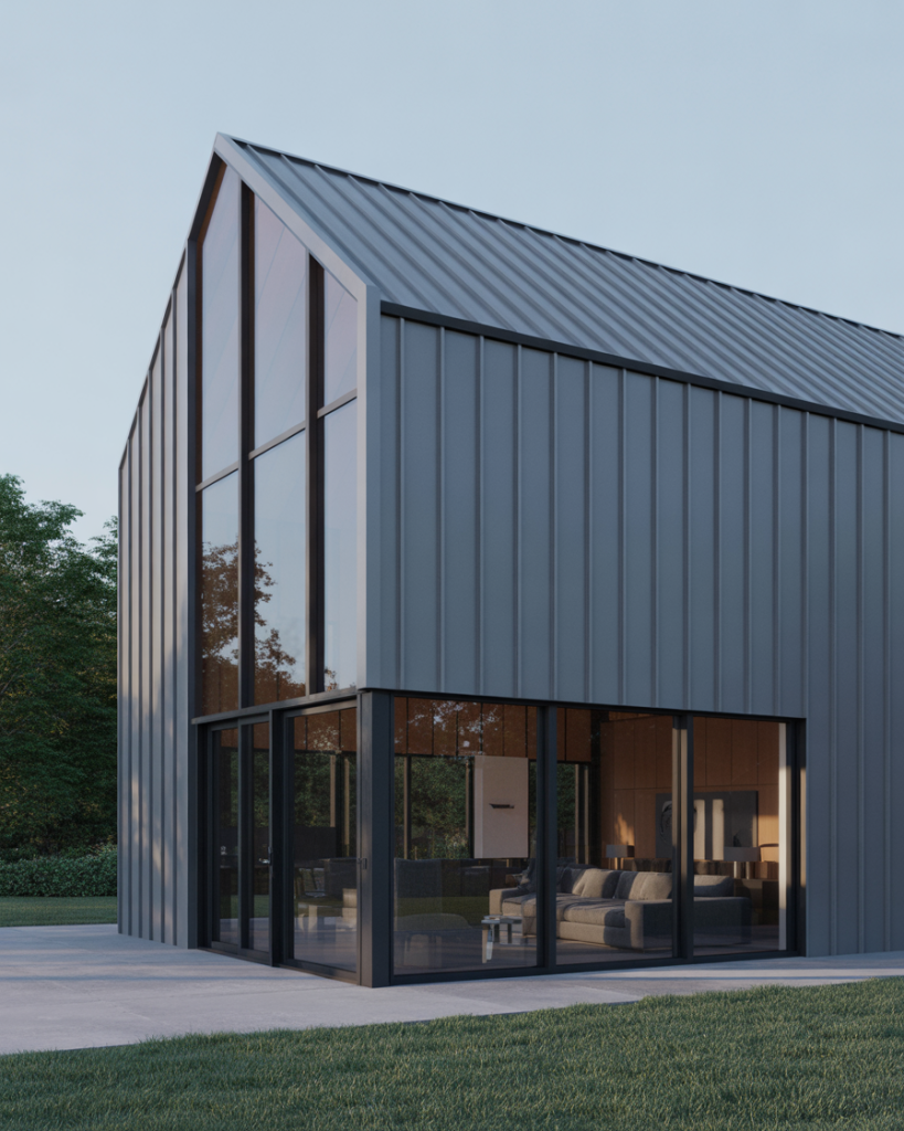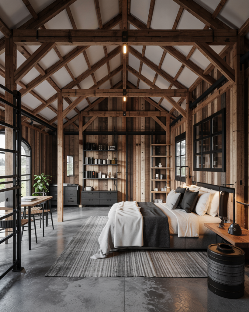 Urban meets rural with an industrial-style barndominium. Exposed steel beams, concrete floors, and black window frames create an edgy modern interior. The exterior often mixes metal and reclaimed wood, giving it a rustic yet contemporary tone. Wide floor plans with open sightlines and tall ceilings make it ideal for artists or designers who appreciate functional creativity.