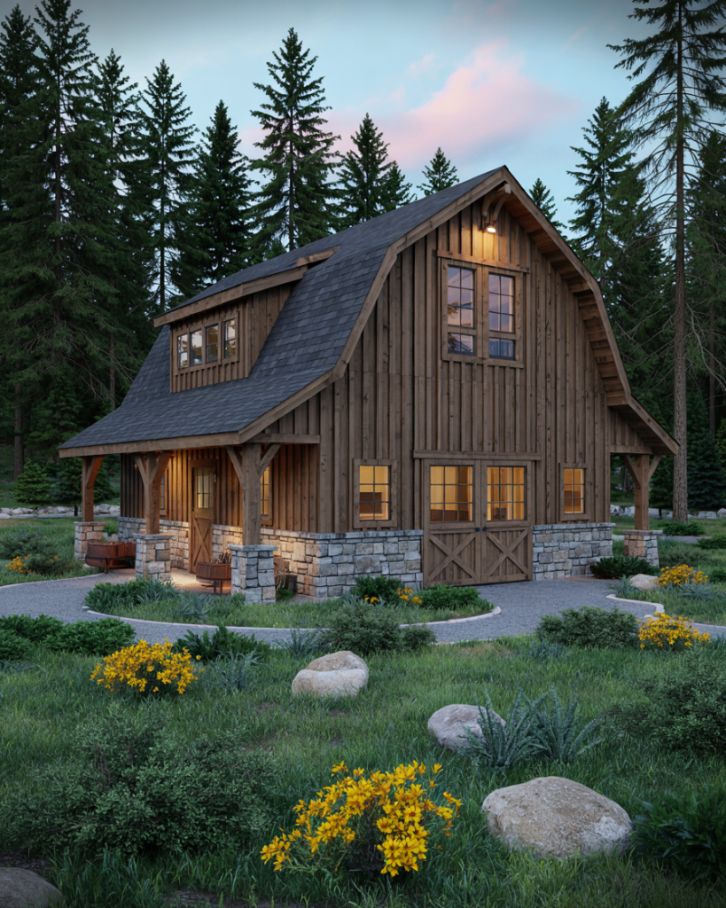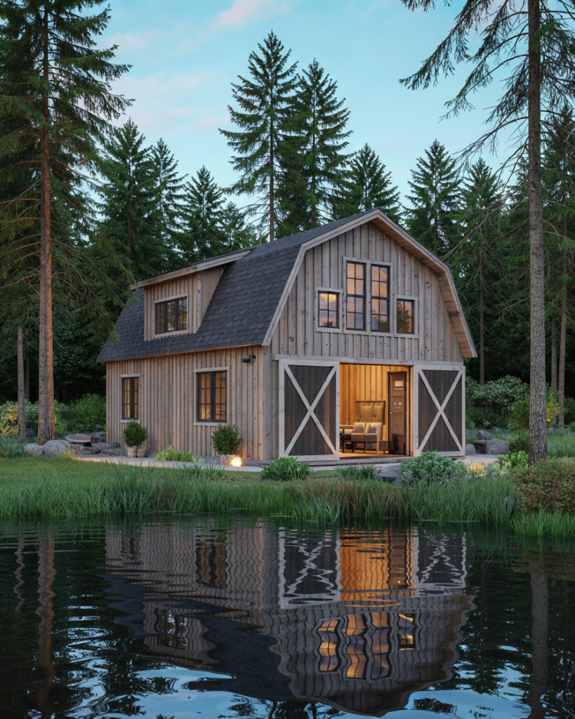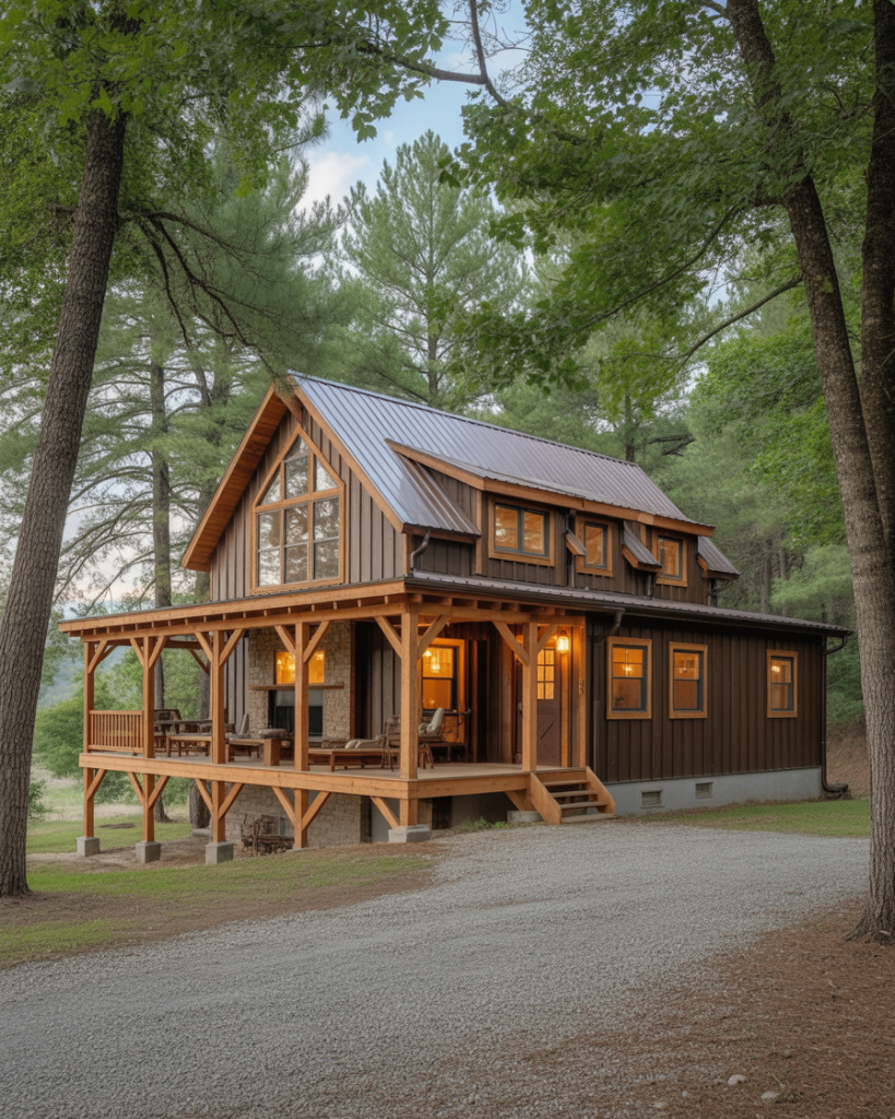 For those dreaming of peace and privacy, a cabin-inspired barndominium is a true sanctuary. Surrounded by nature, it combines cozy interiors with earthy exterior colors like deep green or brown. Stone pathways, wraparound porches, and warm rustic details make this design timeless. Whether as a vacation home or permanent retreat, it reconnects you with simpler living.