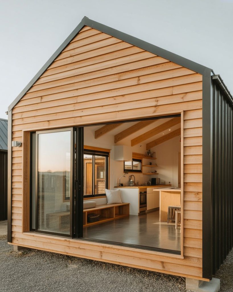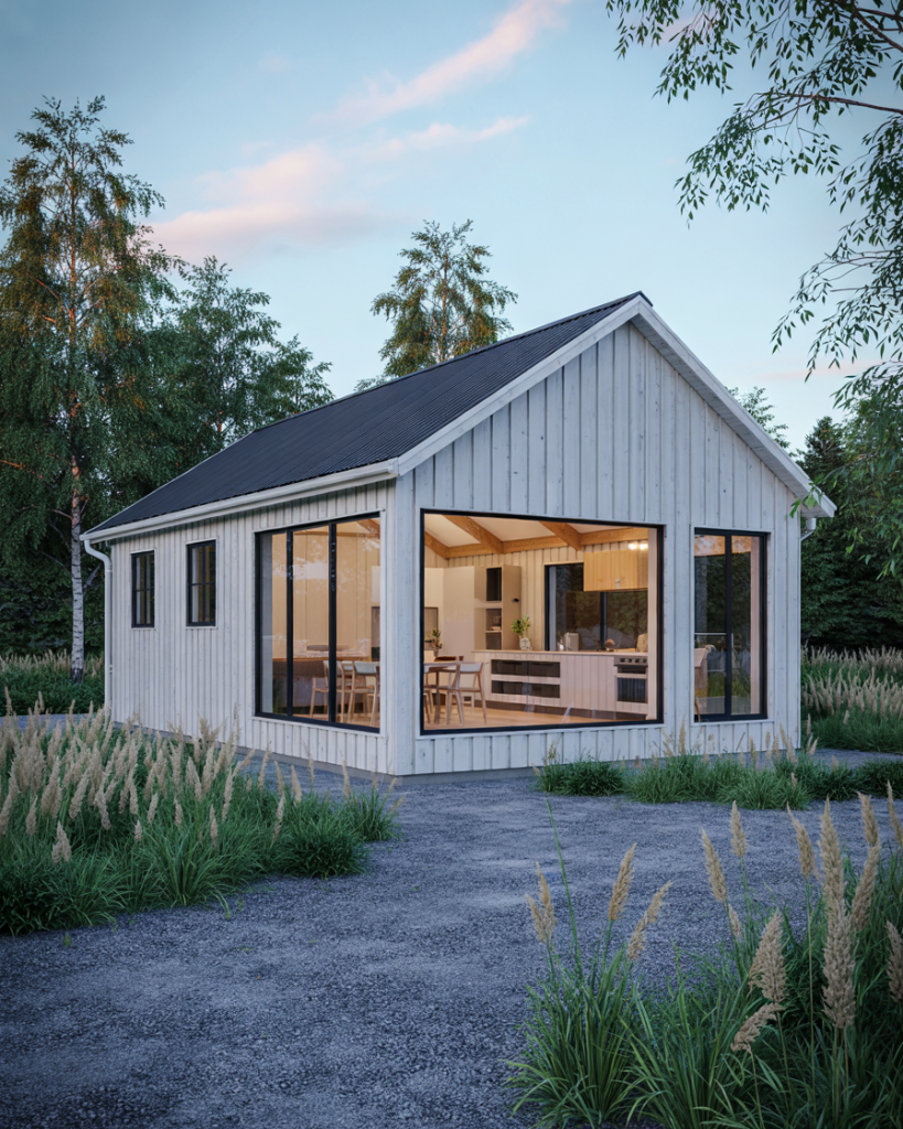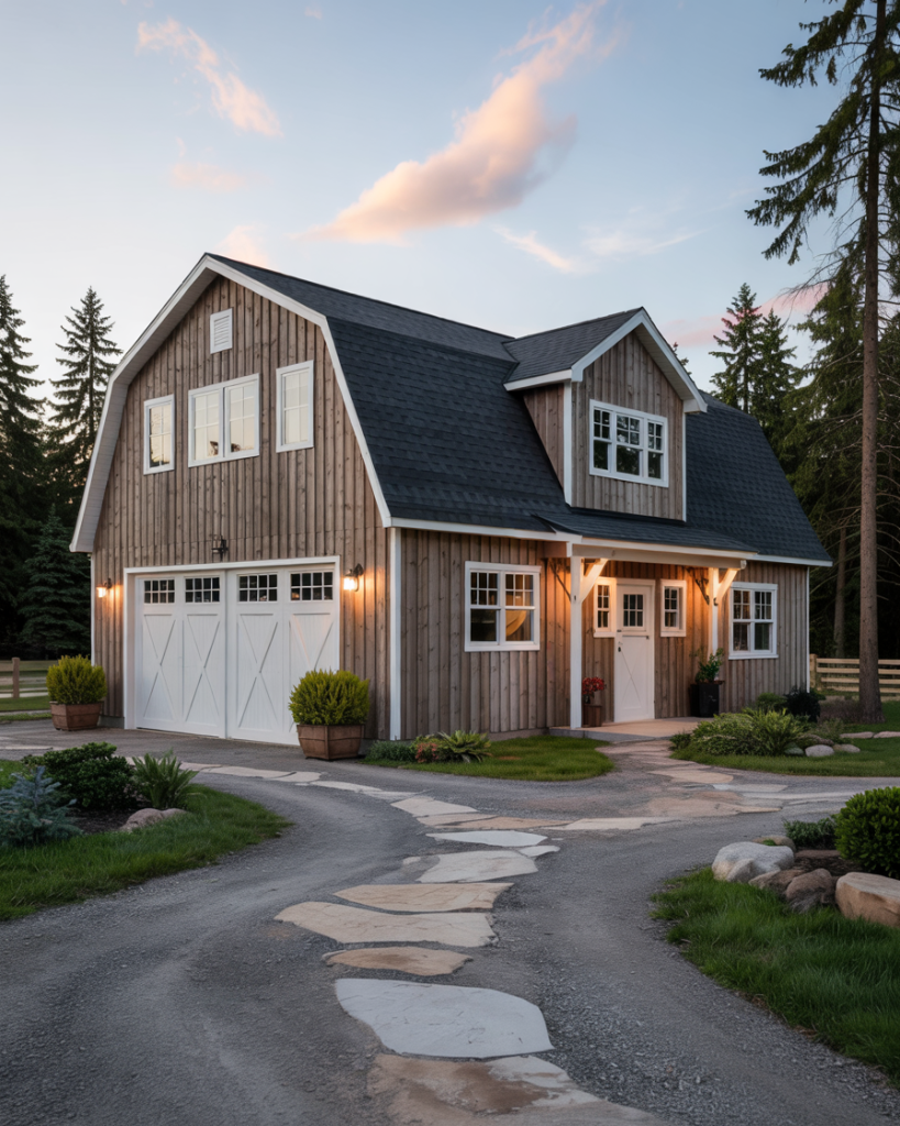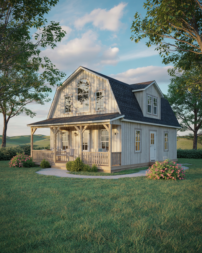A This simple and compact barndominium proves that great design doesn’t require massive space. Small floor plans emphasize smart storage, efficient layouts, and light-filled interiors that maximize every inch. Pairing neutral exterior colors with natural wood makes the home appear larger and more inviting. Chip Wade, HGTV designer, once said that small homes “inspire intentional living,” and this idea captures that perfectly.