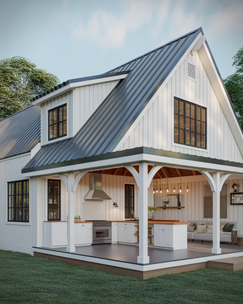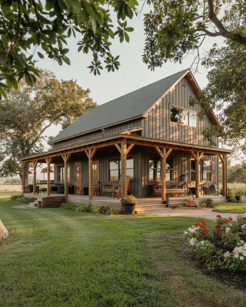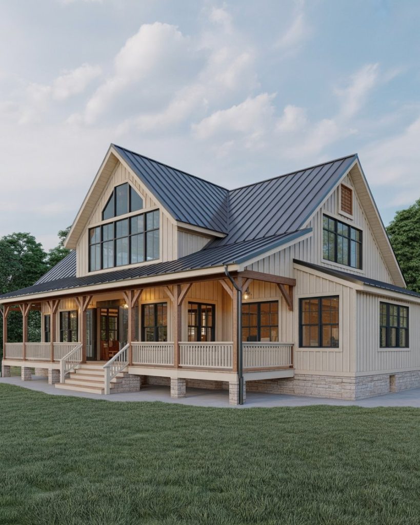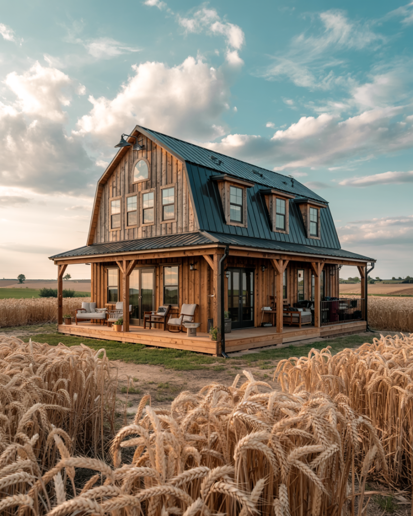 An affordable yet stylish approach is the modern farmhouse barndominium. Mixing metal roofs with board-and-batten siding, this design achieves luxury at a cheap cost. Inside, open floor plans and functional kitchen islands give it a designer look without breaking the bank. It’s perfect for first-time homeowners who want charm, comfort, and practicality rolled into one.