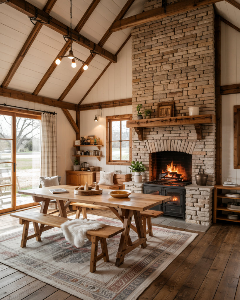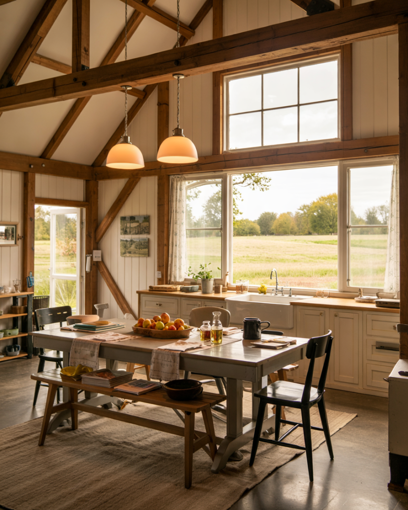 This hybrid combines cabin coziness with rustic barn architecture. Reclaimed timber and stone dominate the exterior, while rustic interior spaces feature warm lighting and open floor plans. Ideal for mountain regions, it provides that log-cabin feel without the traditional footprint. The kitchen becomes a natural gathering hub with earthy tones.