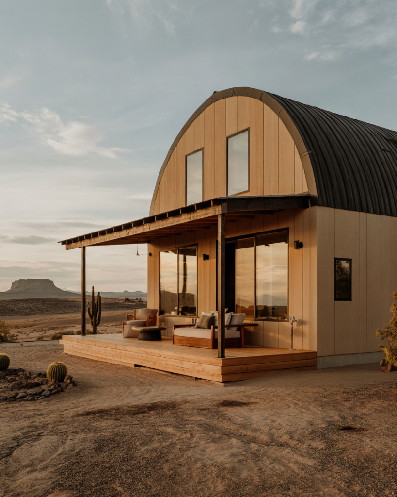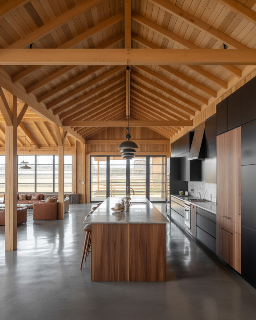 Barndominiums also thrive in the desert. Stucco Exterior finishes, flat roofs, and exterior colors like sand, terracotta, or black steel accents blend with the landscape. Inside, modern interior layouts focus on airflow and simplicity. Add polished concrete floors and natural wood for warmth. This simple aesthetic feels luxurious yet eco-conscious.