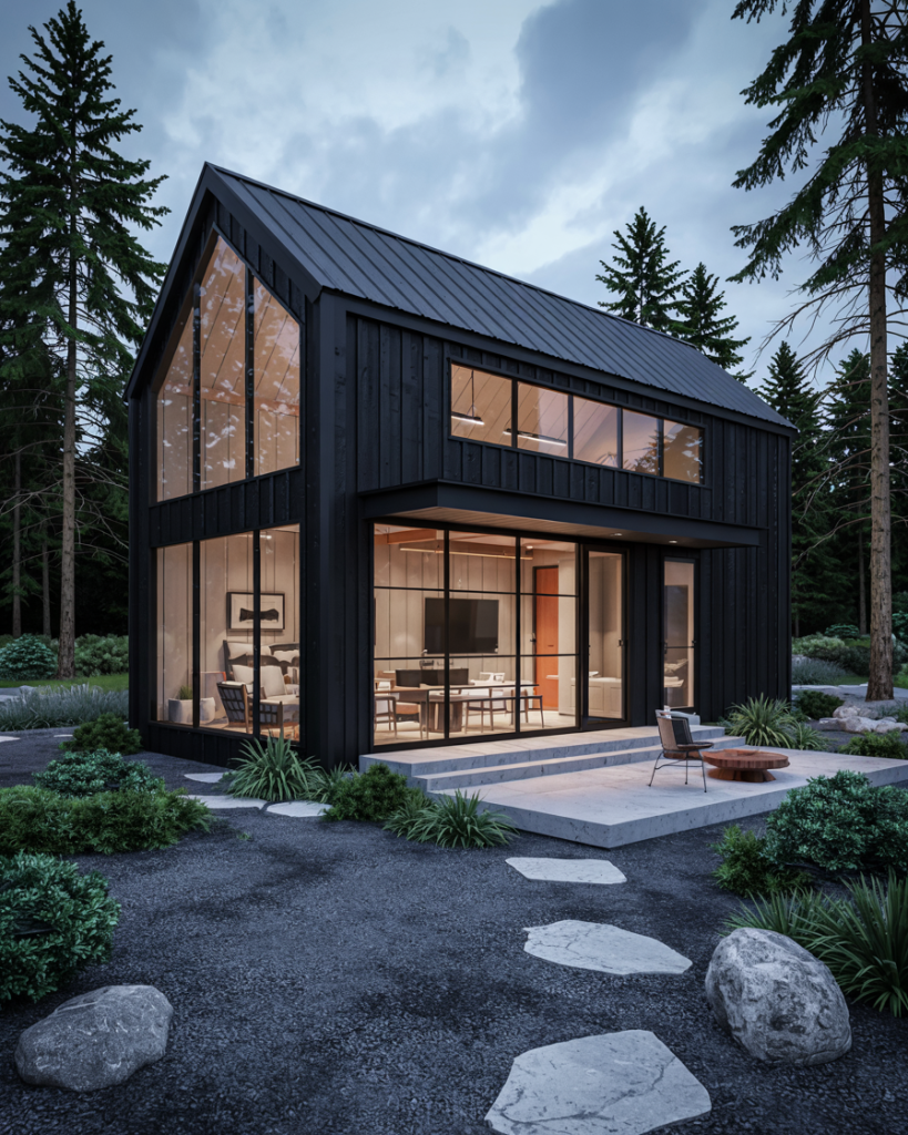 A black barndominium is dramatic yet refined. The deep exterior tone paired with the modern white interior walls and warm wood details creates a perfect contrast. This look suits homeowners who want contemporary curb appeal with subtle country roots. The simplicity of the floor plans keeps the focus on bold design and textures rather than clutter—making a strong first impression on any level.