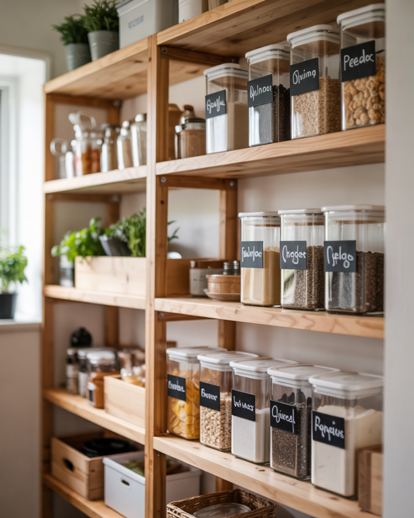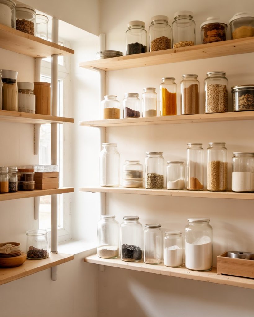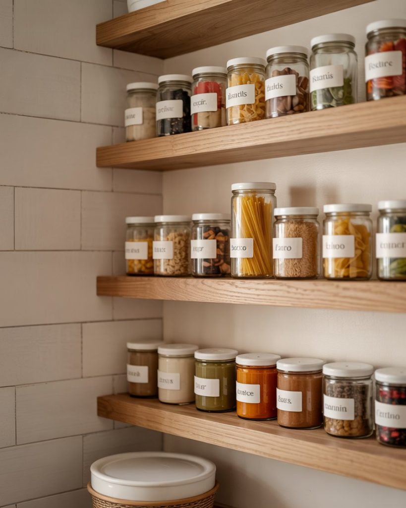Switching to clear jars and containers gives your pantry a sleek, minimalist look and keeps food visible. It’s perfect for tiny pantries or small closet conversions. Grouping by color and size makes everything look intentional and organized. Clear storage works in any kitchen, and it’s an affordable way to feel instantly cleaner and calmer.
