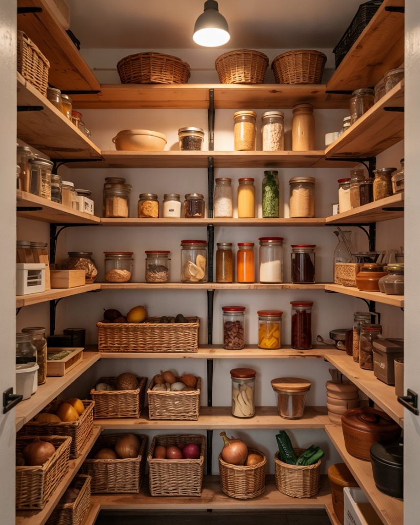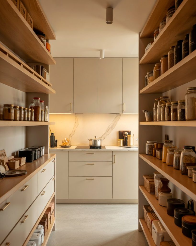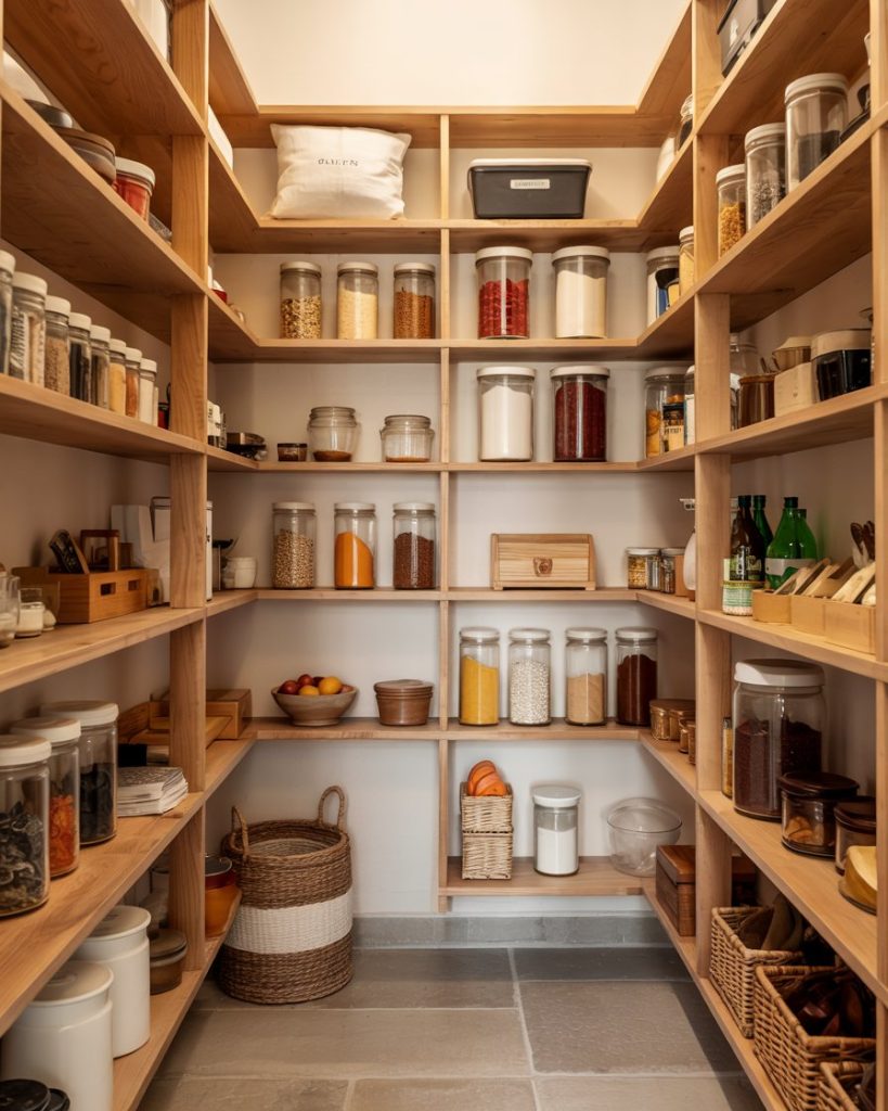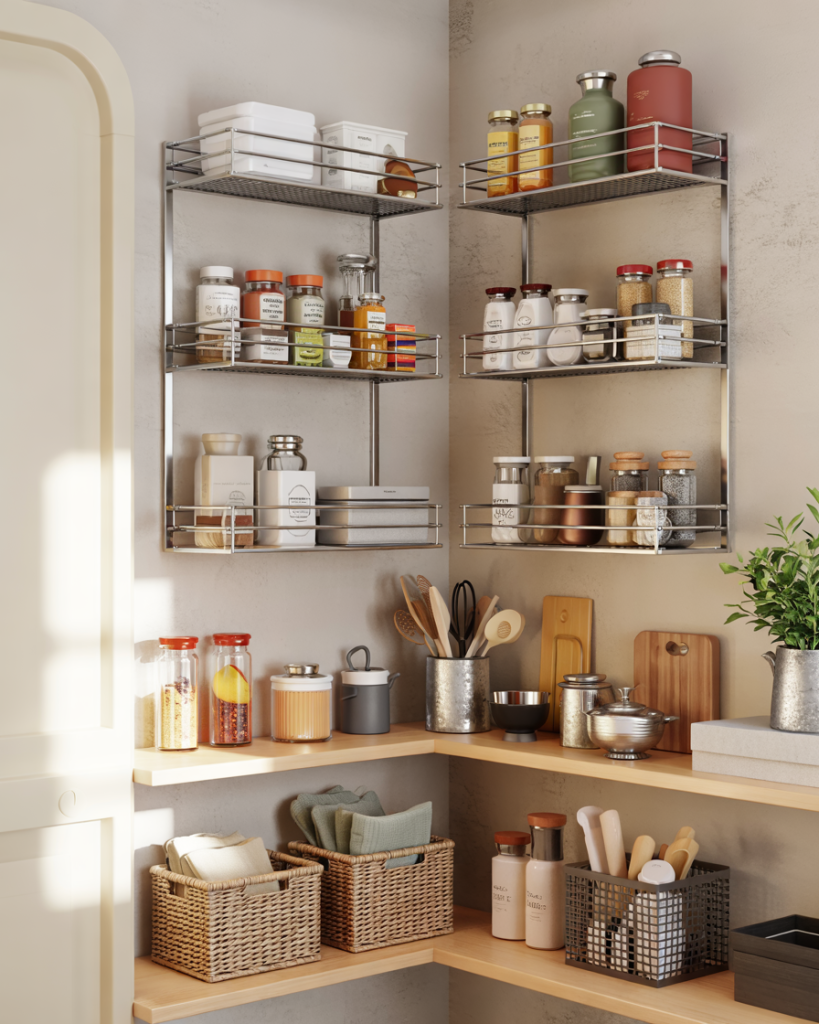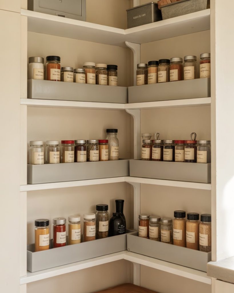 In a corner pantry, visibility can be tricky. Add tiered trays or steps to keep small jars in view. This layout works for any kitchen, from tiny apartments to larger walk-in setups. It’s a professional tip that adds function and aesthetic balance without needing a full remodel.
