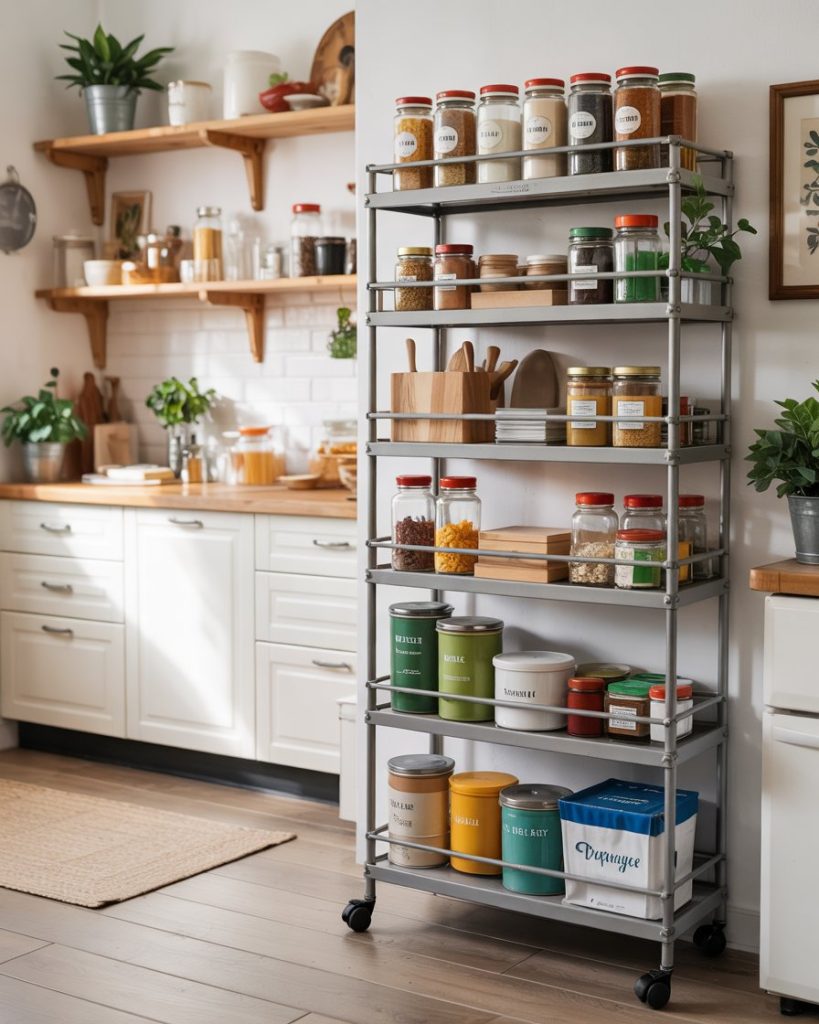 A slim rolling cart can be a game changer in small kitchens or apartments. Slide it between cabinets or next to the fridge for extra shelves to hold spices, oils, or snacks and treats. It’s a smart DIY fix that makes your kitchen more functional without renovation. Plus, it’s portable—perfect for tiny homes or busy families needing flexible storage.