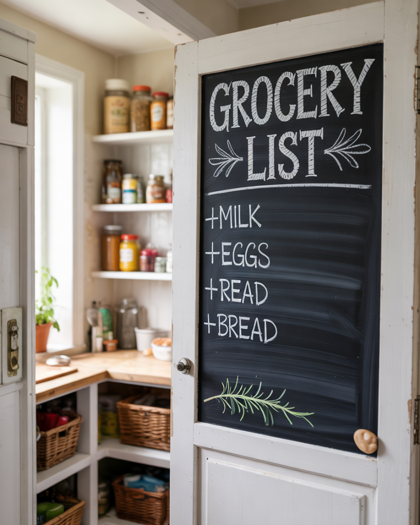 Turn your pantry door into a creative message board. Paint the inside with chalkboard paint and jot down shopping lists or quick meal ideas. It’s an easy DIY project for a budget and gives a personalized touch. Whether in a walk-in or small closet, this idea adds charm and function to any kitchen space.