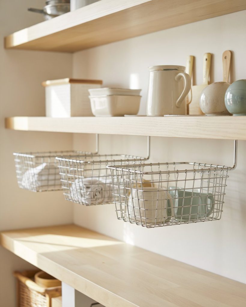 If your kitchen lacks horizontal space, go vertical. Hanging wire baskets beneath shelves create extra layers for fruit, bread, or snacks and treats. This affordable solution fits tiny pantries or small kitchens and keeps items easy to grab. It’s a clever DIY trick decorators love for mixing beauty and practicality.