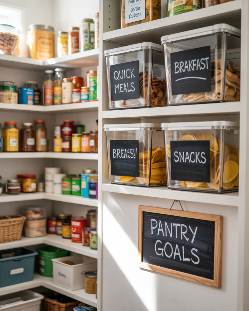 Organize your pantry based on meal types rather than ingredients. Keep everything for quick meals—like pasta, sauces, and canned beans—on one shelf. This saves time for busy families and makes the kitchen workflow smoother. Add bins labeled “Breakfast,” “Dinner,” or “Snacks and treats” for an efficient setup that looks stylish too.