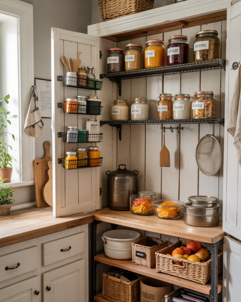 Corner spots are often ignored, yet they can be gold for tiny or small kitchens. Add rotating trays, lazy Susans, or tiered wire baskets to utilize every inch. It’s a clever DIY move that professionals recommend to make your pantry work smarter. This trick brings function to awkward areas and maximizes every bit of your storage zone.