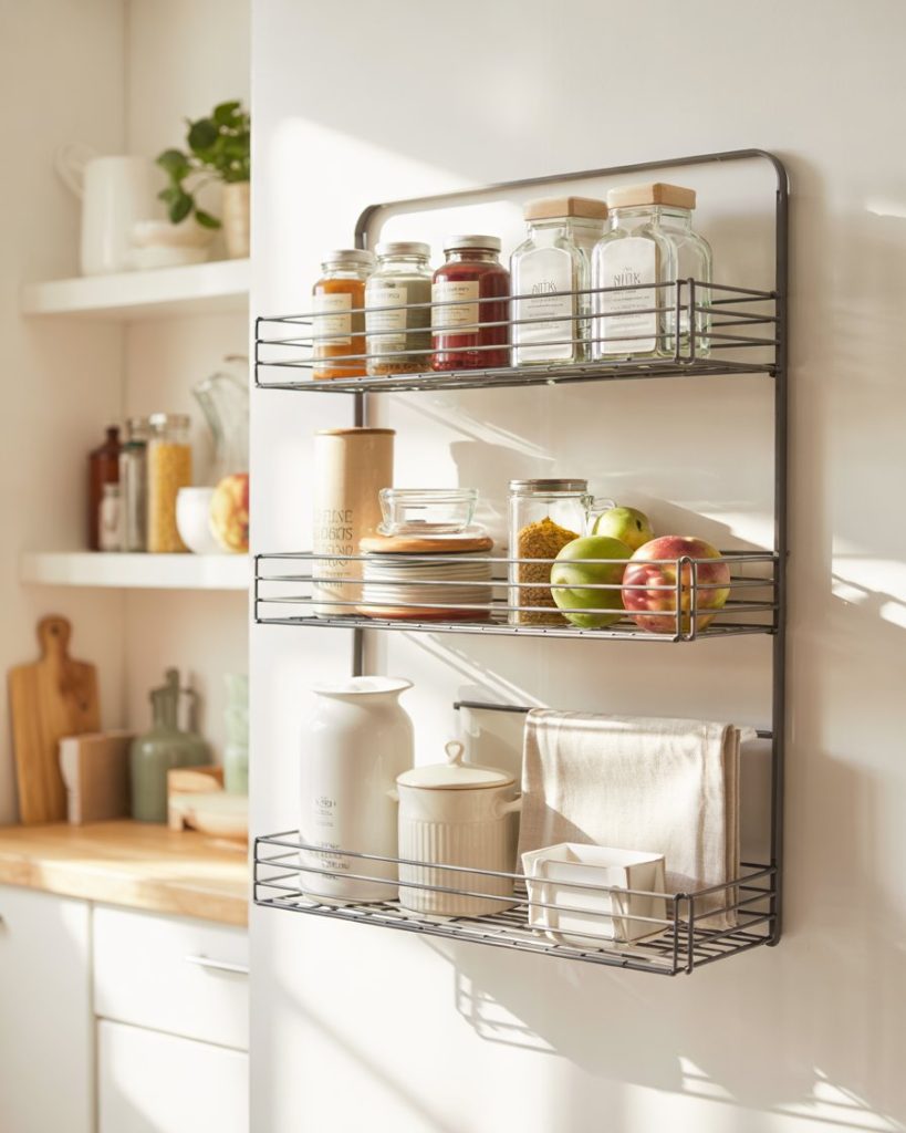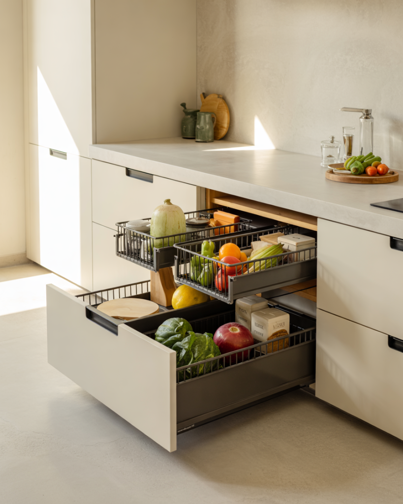 Install sliding wire drawers under counters or inside cabinet bases. These drawers are perfect for tiny small kitchens or apartments where every inch matters. Use them for root veggies, napkins, or packaged goods. It’s a sleek, affordable idea that brings efficiency and elegance into everyday life.