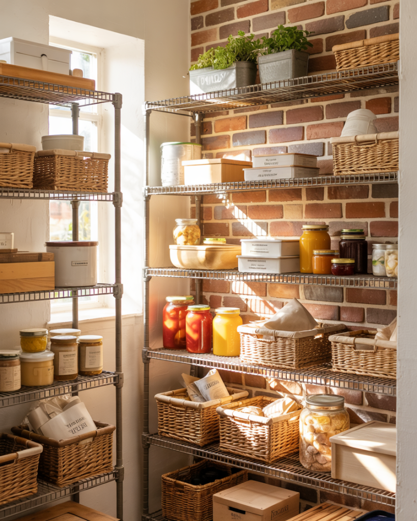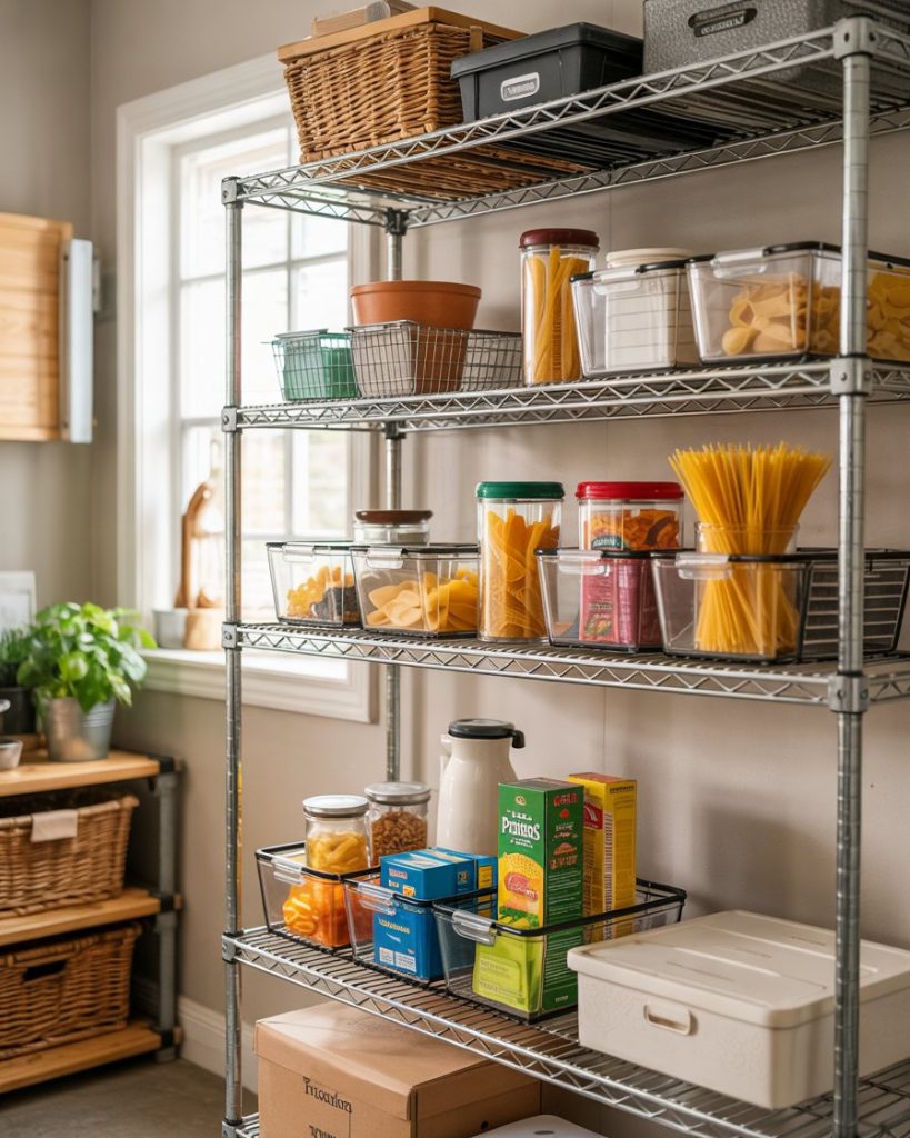 A wire shelf system is great for lightweight and flexible organization. These units work well in small pantries, corner nooks, and even in garage setups.