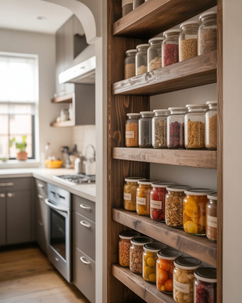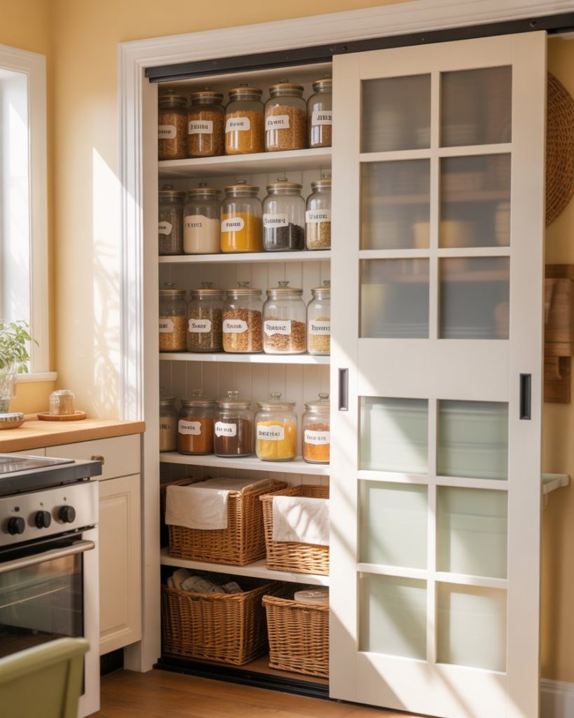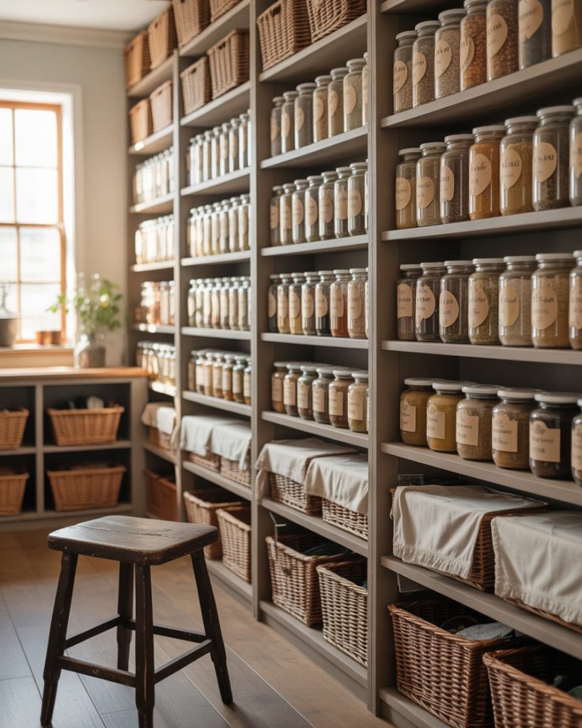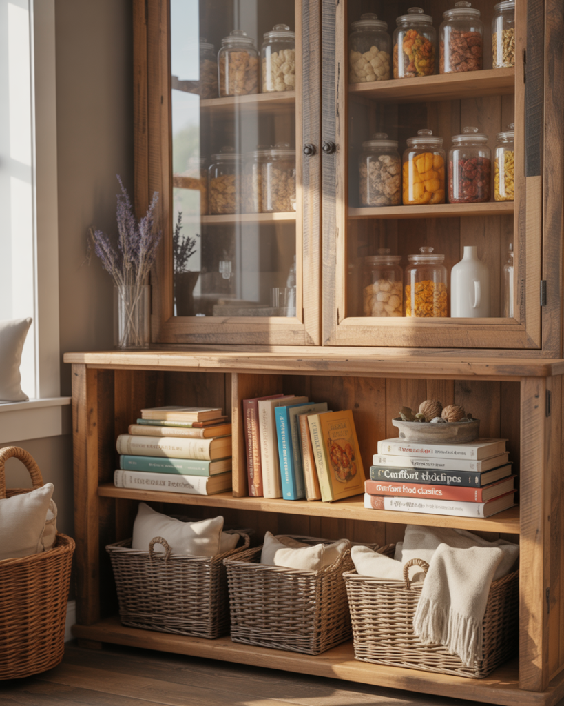 In open-concept homes, a pantry can extend into the living room. Glass cabinets or vintage hutches filled with jars and baskets create both storage and display. Designers at Domino often note that food storage styled intentionally becomes part of the decor. This works especially well when your kitchen space is small, but you still want a curated, warm look in shared areas.