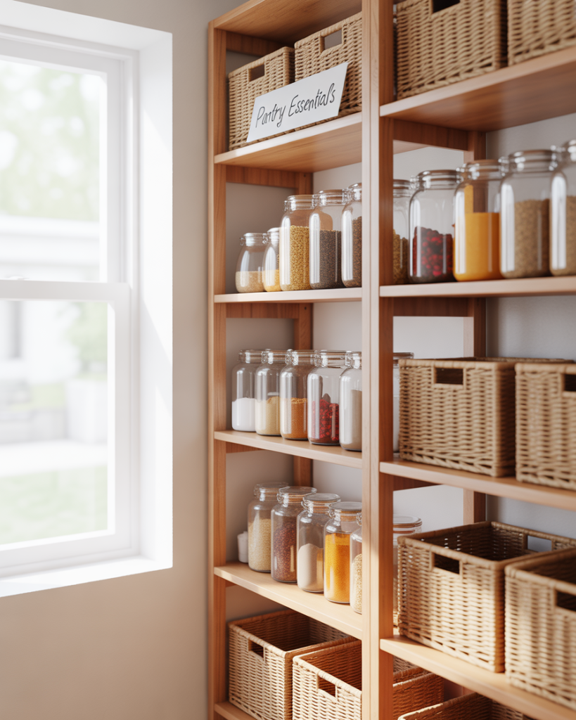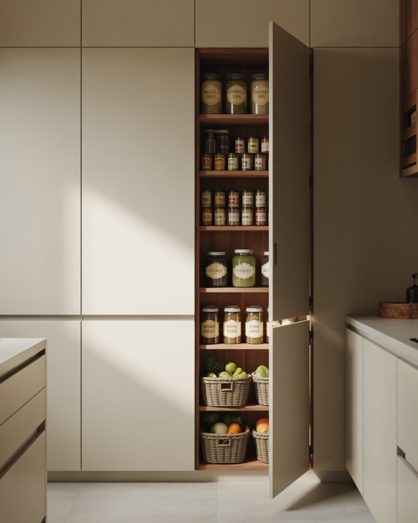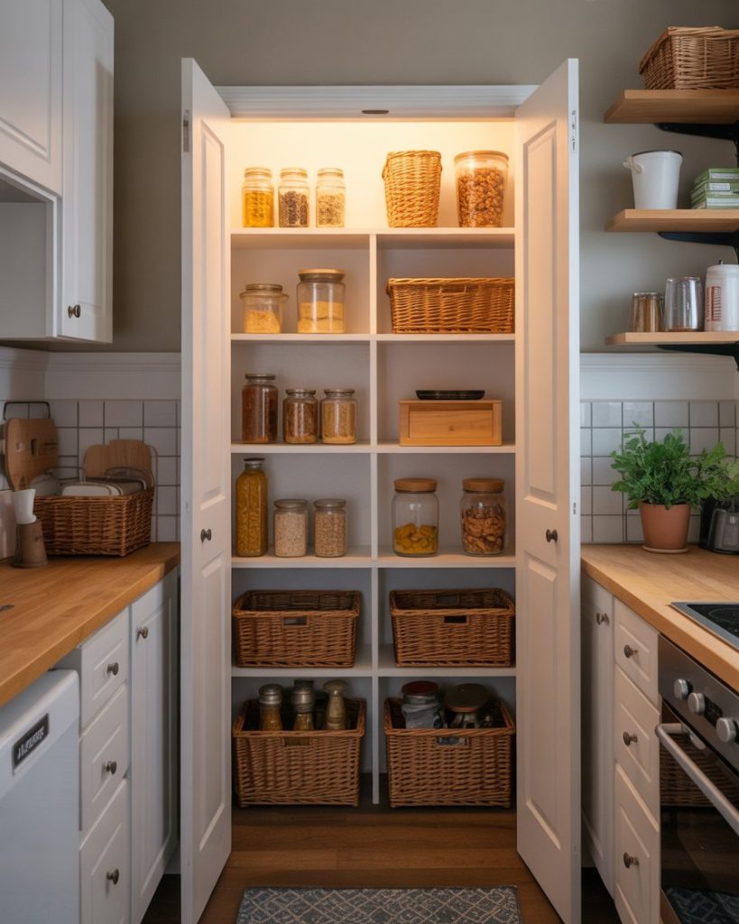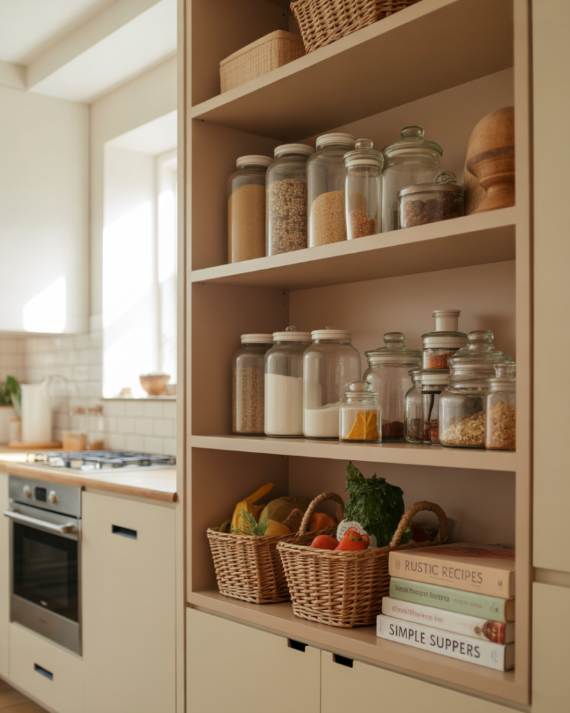 In open-concept homes, a pantry can extend into the living room. Glass cabinets or vintage hutches filled with jars and baskets create both storage and display. Designers at Domino often note that food storage styled intentionally becomes part of the decor. This works especially well when your kitchen space is small, but you still want a curated, warm look in shared areas.