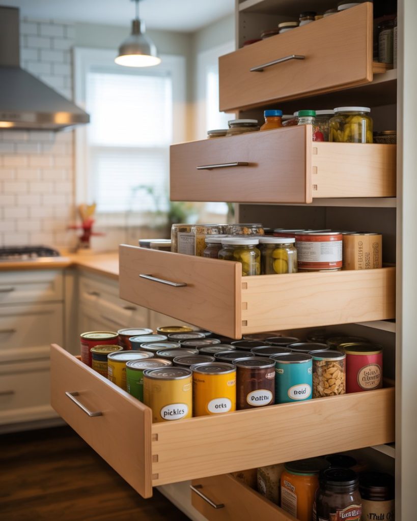 Installing pull-out drawers creates a smooth layout storage system that maximizes depth. Instead of deep, dark shelves, every item slides into view. This method is praised by designers like Studio McGee for its practicality, especially in tiny kitchens or even closet conversions. The convenience of reaching the back without bending or losing track of items makes it feel like a mini walk in pantry.