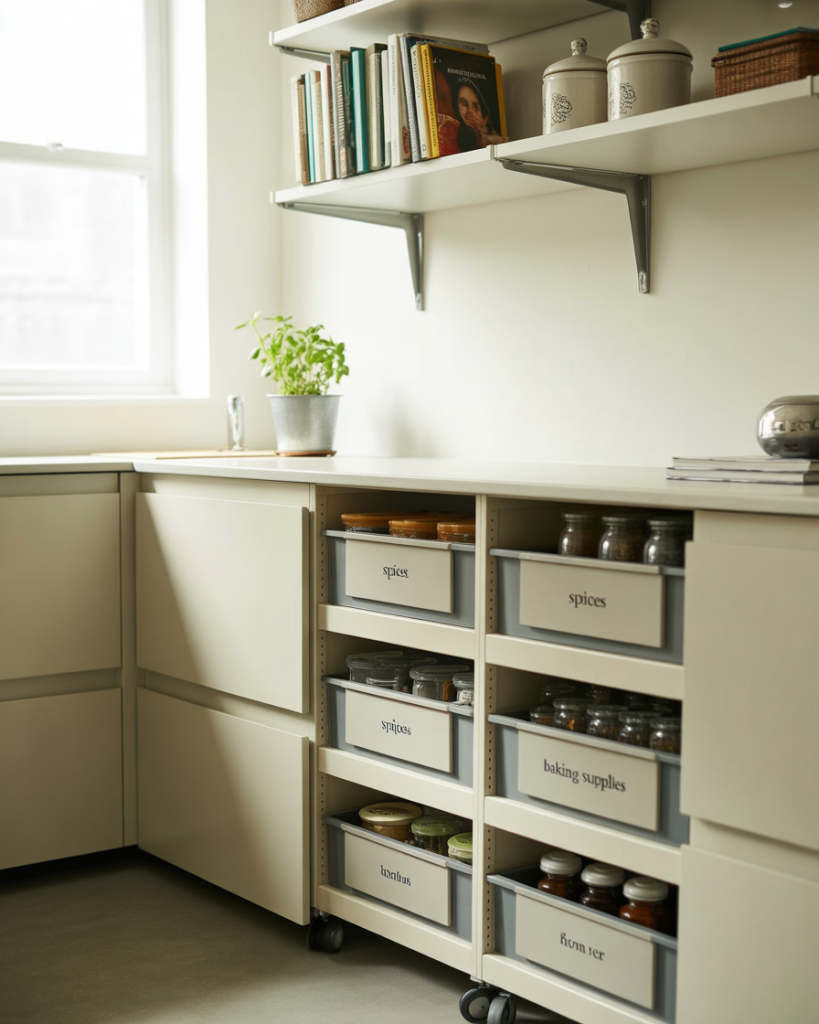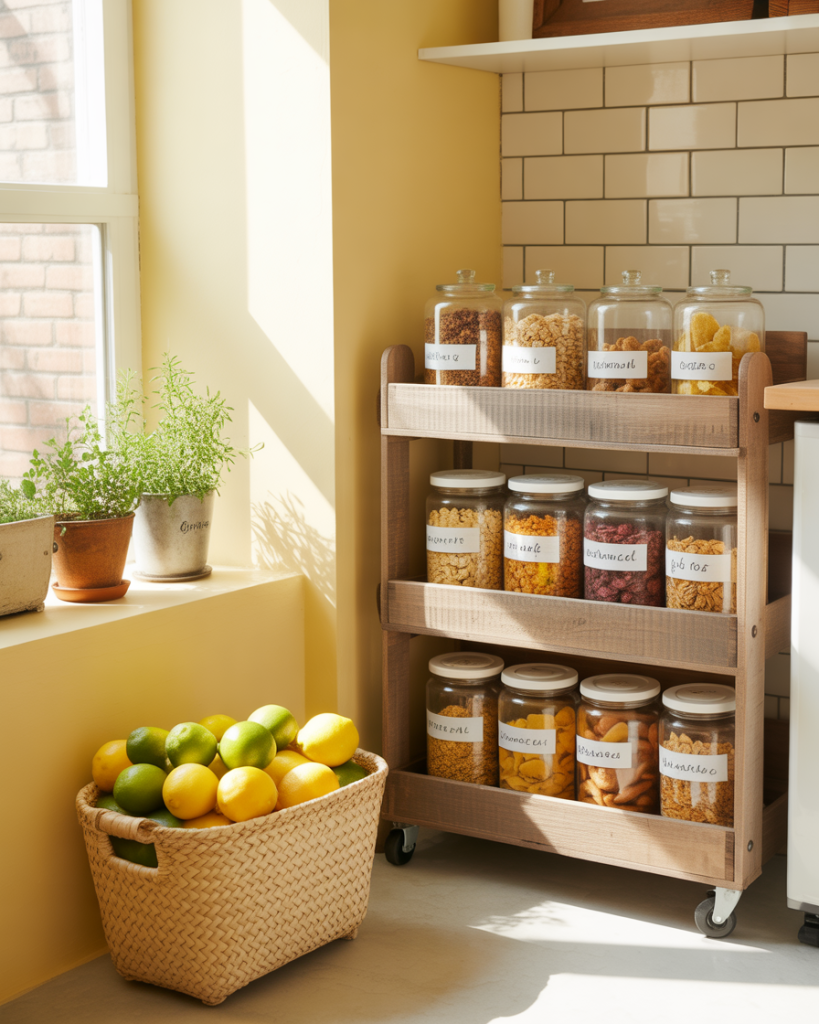 A rolling cart can act as a mobile pantry, shifting between kitchen, office, or even living room spaces. This layout storage is loved by minimalists and renters who need flexibility. Designers recommend Ikea carts for their affordability and adaptability. In tiny kitchens, rolling carts can tuck into corners or slide to fridge side areas, holding essentials like spices, oils, or baking supplies.