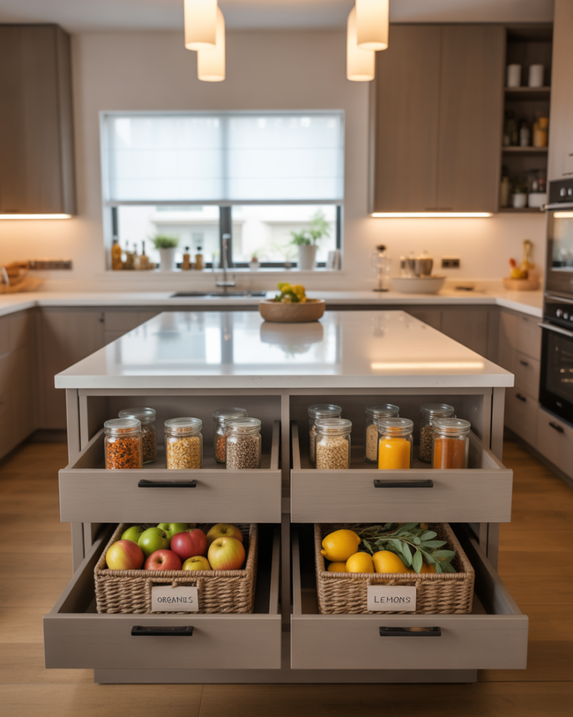 Some modern islands now include hidden pantry drawers or cabinets. This layout storage doubles up: prep on top, storage below. Designers on Houzz often highlight how this trick adds function to small kitchen footprints. For open-plan homes, it’s also close to fridge and cooking zones, making the workflow seamless. It’s an especially chic option for homeowners who want everything at arm’s reach.