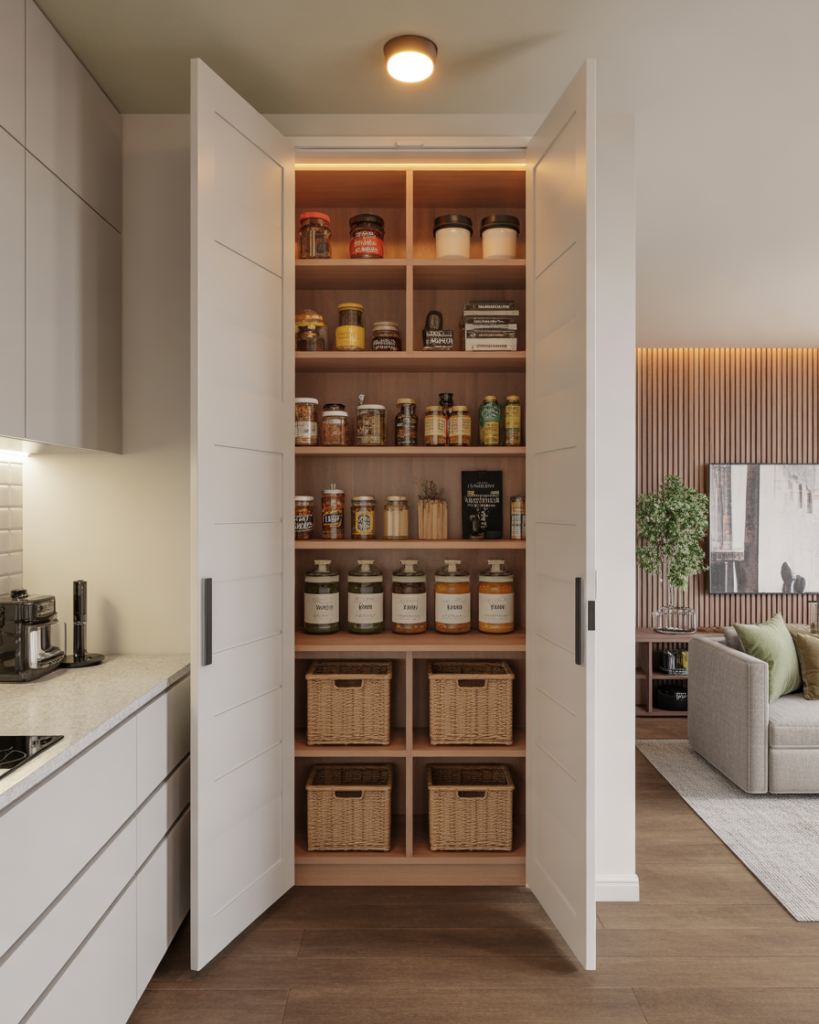Using a hallway niche as a pantry is a very practical idea for apartments. The layout often includes narrow shelving or custom cabinetry, and it works well if placed close to fridge or dining areas. Blogs like Remodelista highlight this design as a way to transform overlooked areas into efficient storage. It’s an especially clever solution when the kitchen doesn’t have extra room but you still need organized food space.