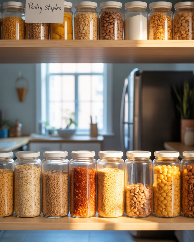 A pantry styled entirely with matching glass jars brings beauty to everyday storage. The layout open shelving shows off textures—grains, spices, and dried fruit—as part of the décor. Blogs like The Spruce recommend this for both closet and open-wall setups. It adds personality to a kitchen or even living room, making food a visual feature rather than something hidden away.