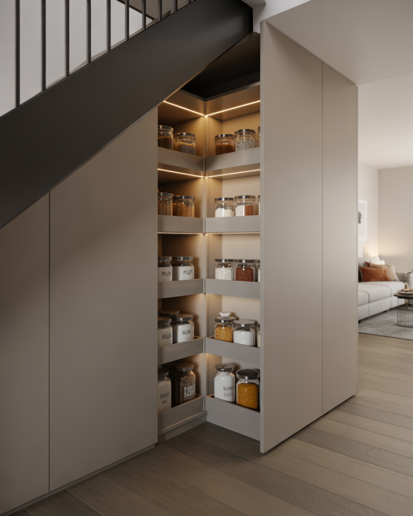 Building a pantry under the stairs is an often-overlooked but very effective solution. This dead space can be transformed into shelving, drawers, or even a small wine rack, creating unique layout storage. Blogs like Apartment Therapy regularly feature readers who use this hack, proving it works in homes of all sizes. By placing storage here, you also keep the kitchen clear and link your pantry closer to the living room.