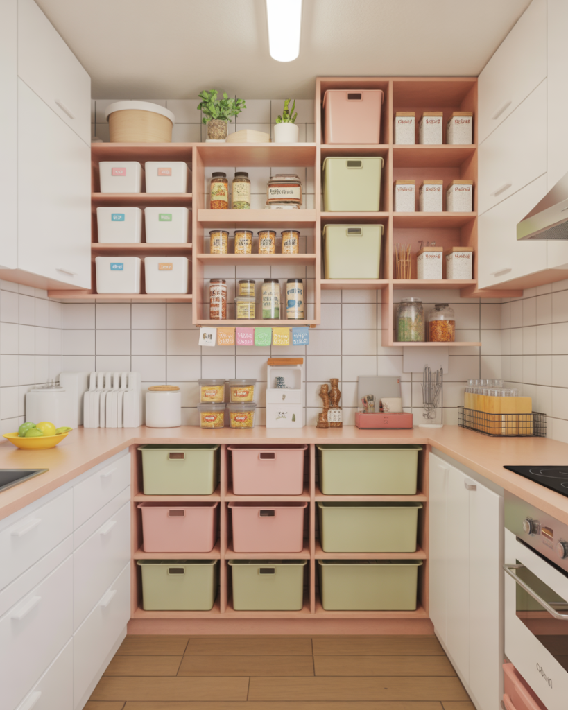 For those who love design games, a Bloxburg-inspired pantry is playful and practical. The layout mimics modular digital grids, using pastel bins, colorful labels, and customizable shelving. It’s especially fun in apartments and tiny kitchens, where storage becomes part of personal expression. Pinterest boards full of these setups show how popular this idea has become with younger homeowners.