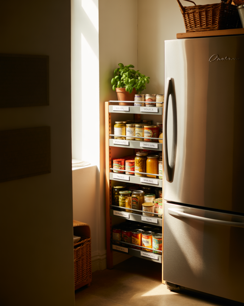 Creating shelving right next to fridge turns wasted space into a smart storage solution. Slim pull-out racks or vertical cubbies are perfect for cans, spices, and dry goods. Blogs like The Kitchn often note that these “dead zones” are ideal for compact pantries. In tiny kitchens, this idea keeps everything close at hand, and I personally love how it makes the pantry and fridge feel like one unit.