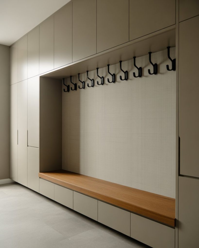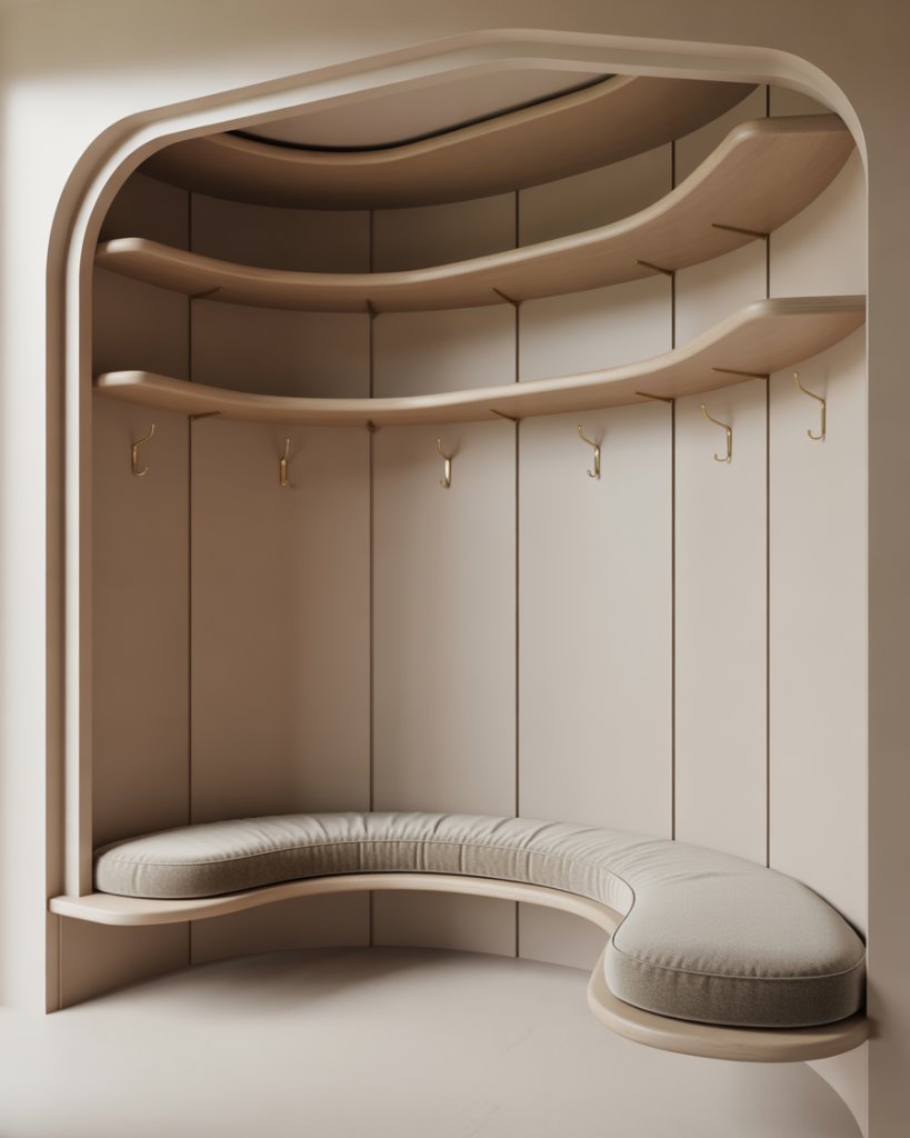 Transform your shaped arch or hallway into a custom mudroom niche. Install curved shelves, a rounded bench, and elegant hooks to complement the architecture. This design blends modern function with artistic form, adding sophistication to even small corner spaces.