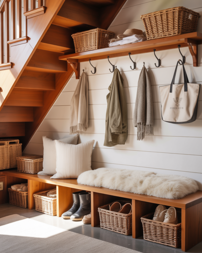 A DIY-shaped mudroom nook can transform an unused hallway or space under the stairs. Add hooks, a bench, and woven baskets for storage. This small project adds style and practicality to your entryway, proving that even awkward corners can become design features.