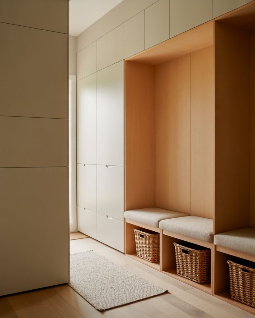 Inspired by Nordic design, a simple modern mudroom emphasizes light, function, and comfort. Pale wood tones, white walls, and minimalist entryway cabinets make the space feel calm and uncluttered. Add a woven rug and natural textures for warmth. This style fits perfectly in small entryways or apartment settings.