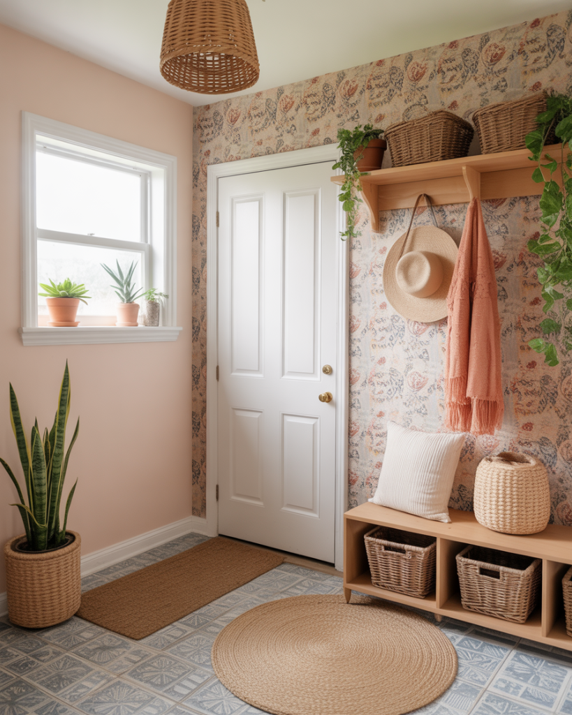 Bring a relaxed vibe to your entryway with a boho-inspired mudroom full of personality. Layer colorful wallpaper, add hanging plants, and use woven baskets for shoes. This cozy corner feels artistic yet functional—great for creative homeowners who love DIY touches and eclectic charm.