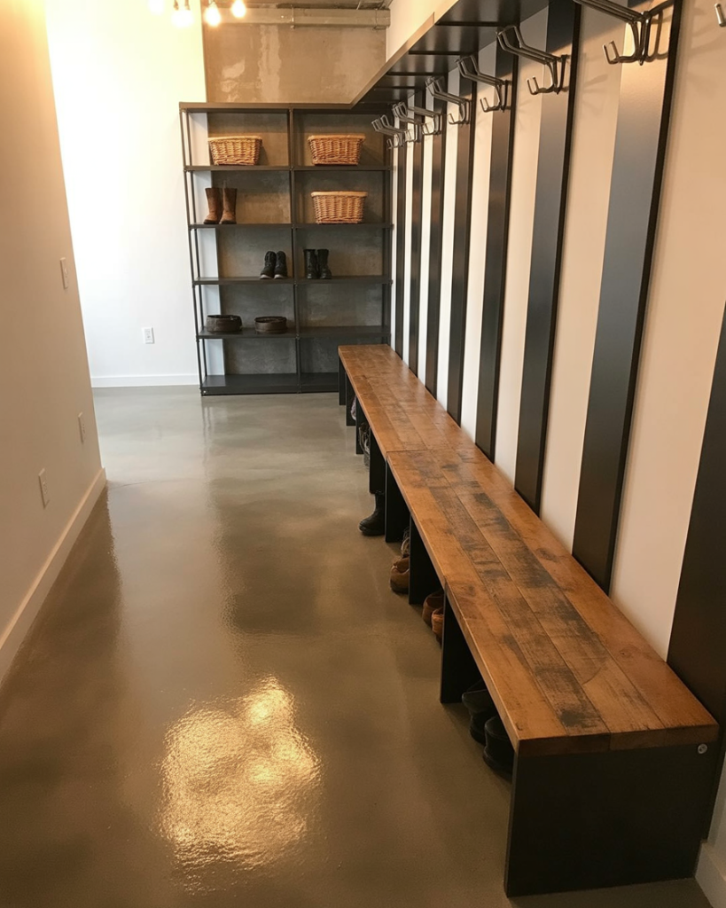 An industrial mudroom suits lofts and urban homes, blending metal hooks, concrete floors, and raw wood. Black-framed entryway cabinets and open shelving keep things organized. This modern aesthetic combines toughness with design and pairs well with garage- or warehouse-style entryway entrances.