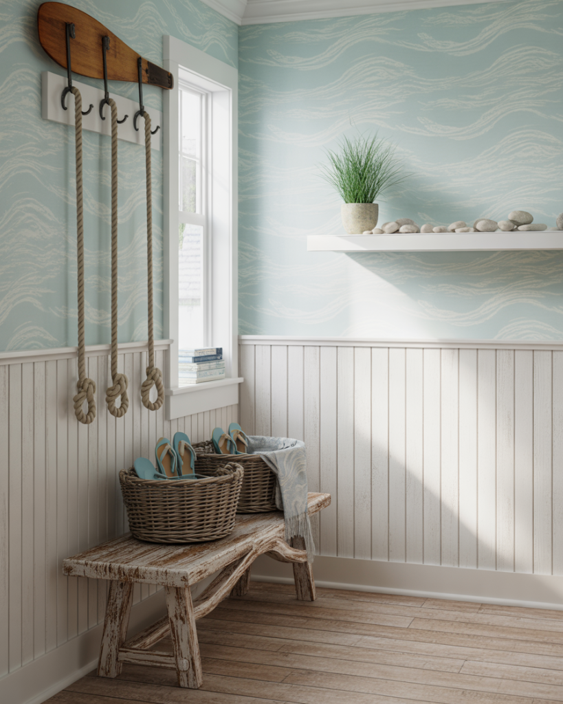 A coastal mudroom brings seaside calm into your entryway. Use light blue wallpaper, whitewashed wood, and rope details. Add a corner bench for sandals and beach gear. This style fits perfectly in large lake houses or tiny seaside cottages, channeling fresh, ocean-inspired relaxation.