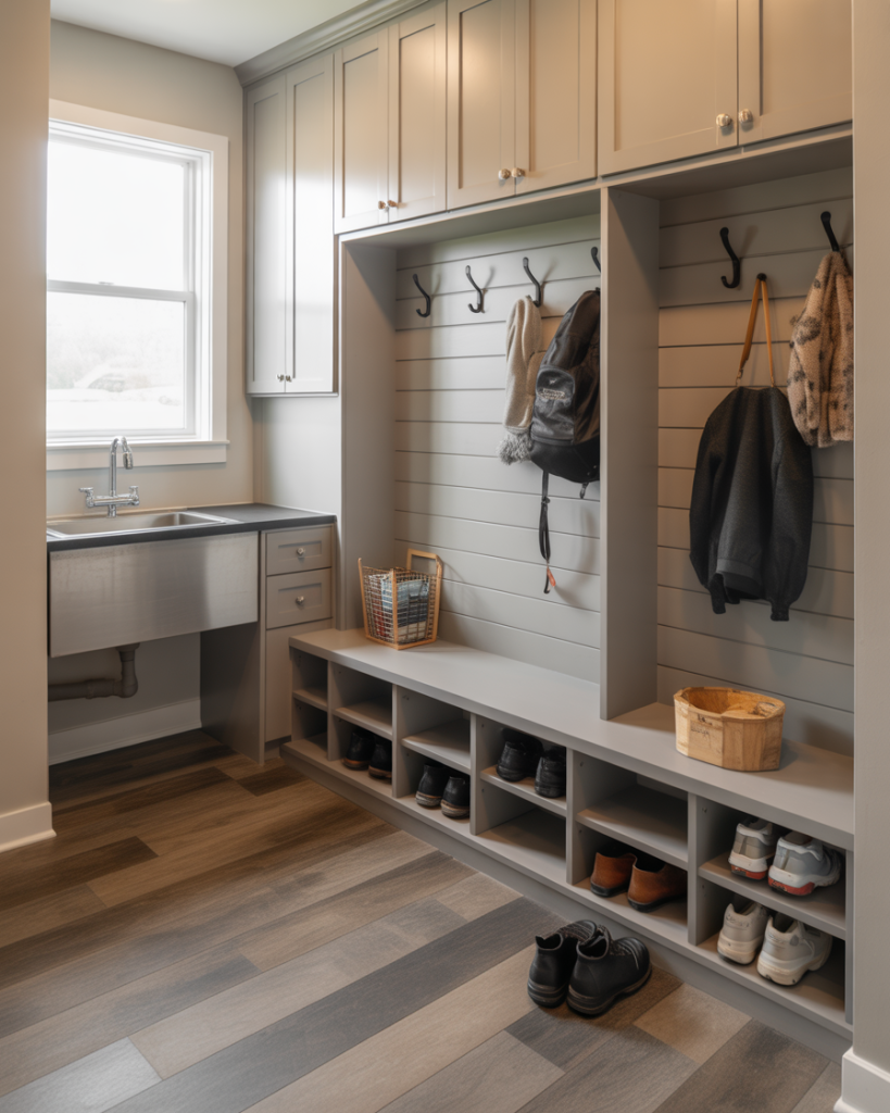 Design a mudroom for both people and pets. Include built-in cubbies for leashes, hooks for coats, and a laundry room sink for washing paws. This modern entryway idea keeps clutter at bay while giving furry friends their own spot. Choose durable flooring that’s easy to clean.