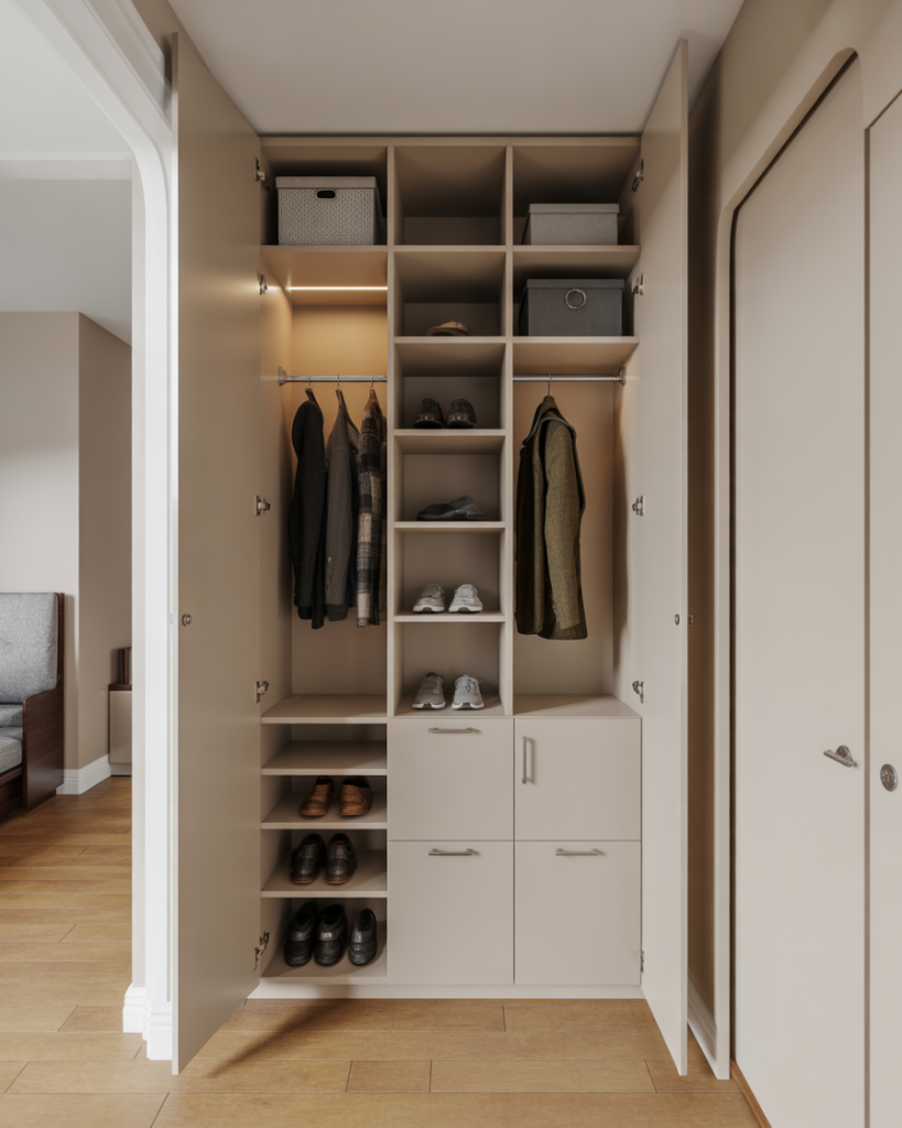 If you lack space, turn a narrow closet near your entryway into a mini mudroom. Add shelves, hanging rods, and small entryway cabinets for shoes. This simple hack keeps clutter out of sight while maximizing storage—perfect for tiny homes or apartments.