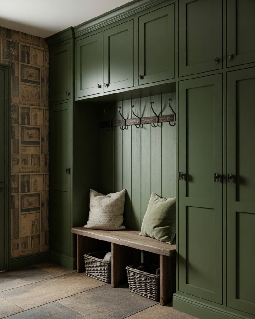 Combine farmhouse warmth with a moody color palette. Deep green cabinets, dark wallpaper, and rustic hooks create a stylish yet grounded modern entryway look. It’s perfect for older homes where vintage meets dramatic charm—a twist on classic country comfort.
