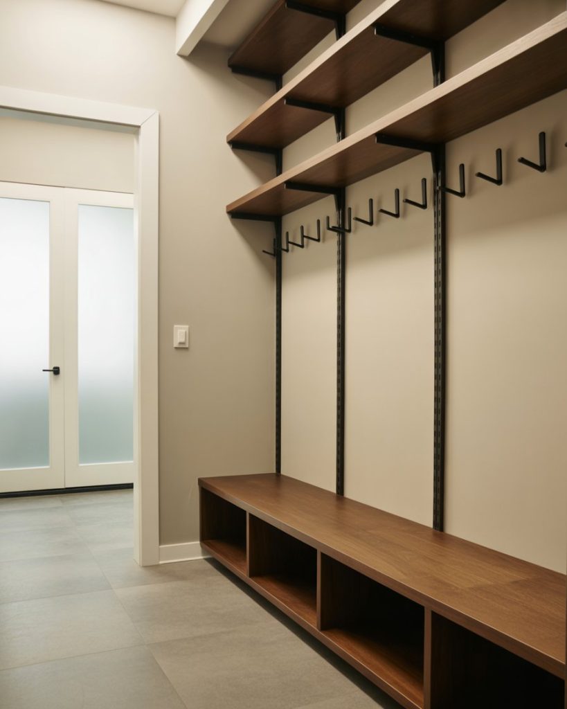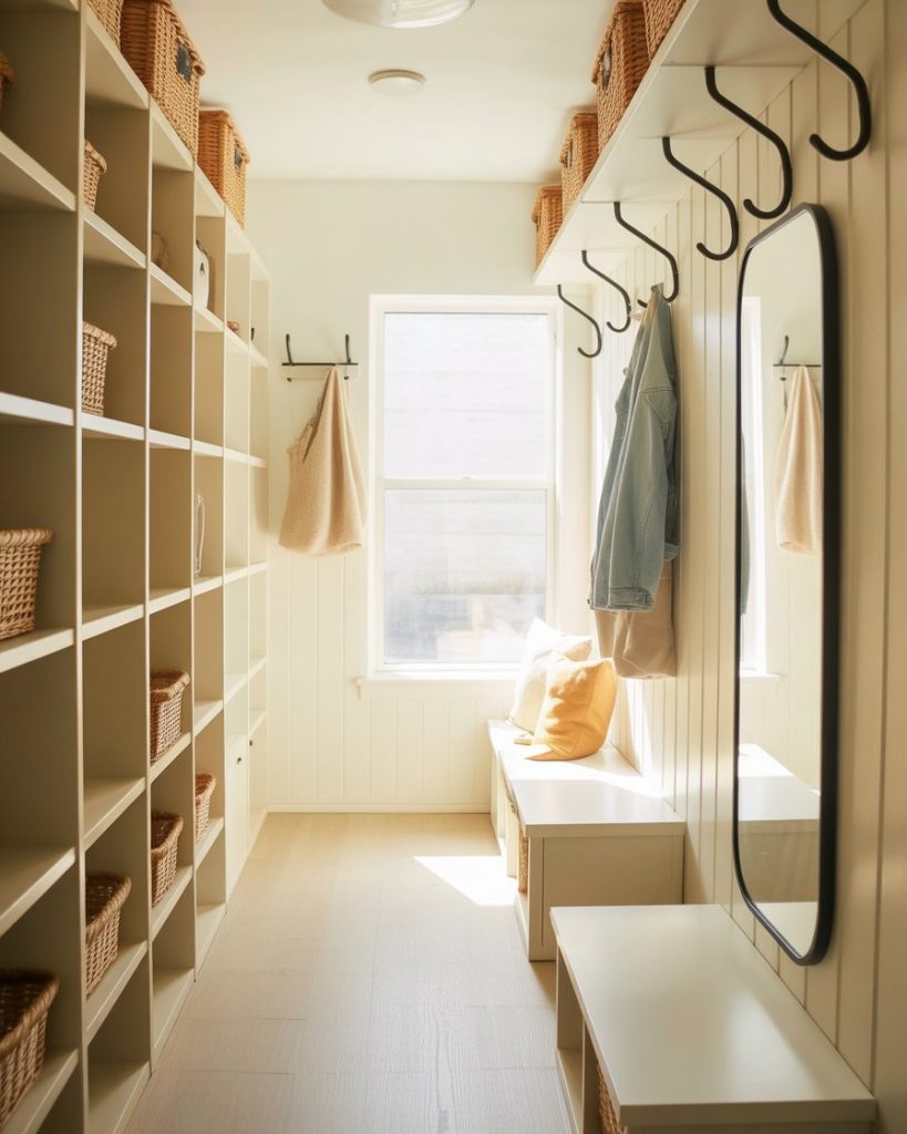 A narrow mudroom can still shine with smart storage. Try vertical shelving, slim entryway cabinets, and hooks to keep everything off the floor. Light colors and mirrors make the entry feel airy and bright. This DIY-friendly setup is perfect for tiny spaces or city apartments where every inch counts.