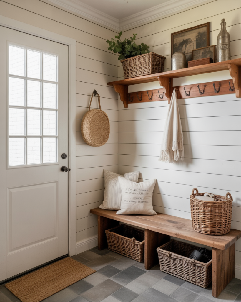A rustic farmhouse mudroom captures cozy charm with reclaimed wood, vintage baskets, and classic entryway accents. Use shiplap walls and a sturdy corner bench with built-in cubbies for boots. It’s a simple, inviting look that fits seamlessly into country-style homes. Joanna Gaines often recommends using natural textures to give this style its warmth and authenticity.