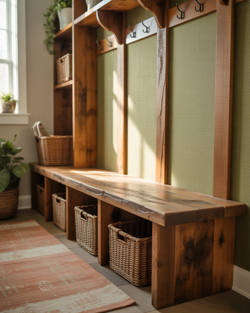 Bring sustainability to your entryway with reclaimed materials. Use salvaged wood for benches and entryway cabinets, adding personality and eco-conscious flair. Pair it with rustic lighting and natural wallpaper textures for a timeless DIY look that tells a story.