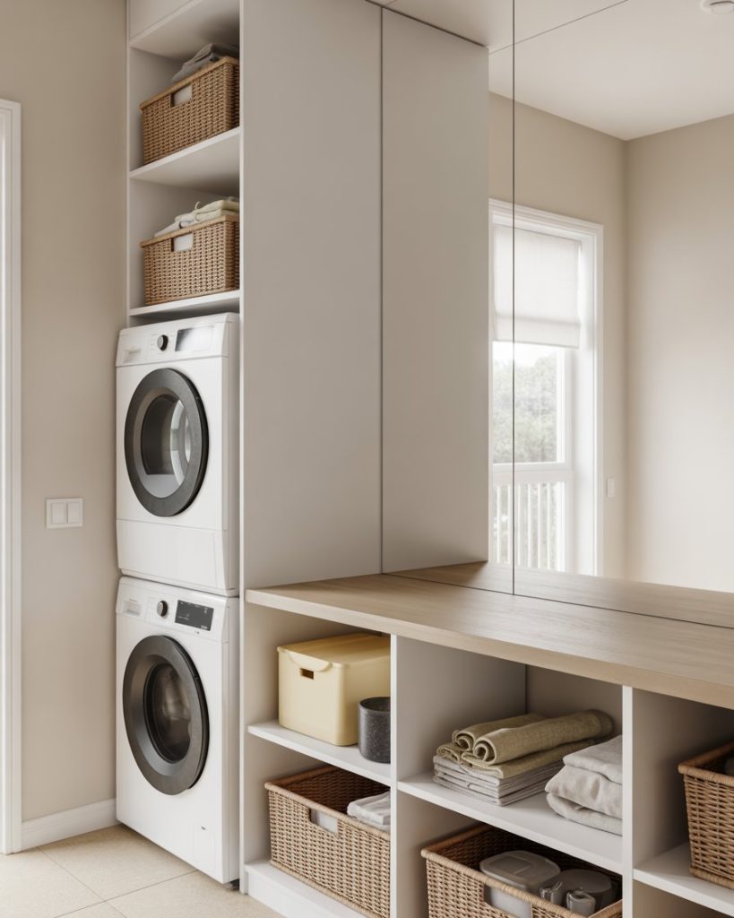 Combine your entryway laundry and mudroom into one functional zone. A stacked washer-dryer next to open shelving and a folding counter turns chores into a smooth routine. This modern setup suits busy families or small homes, and affordable Ikea bins keep everything neat and organized.