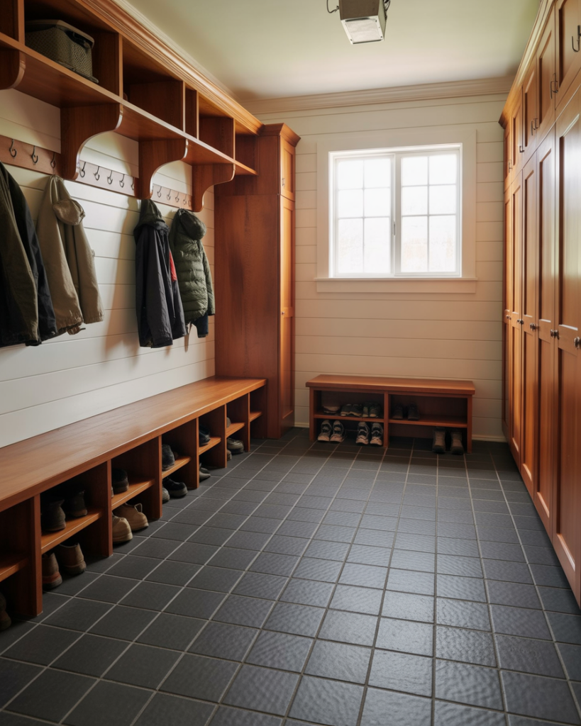 Turn your entryway garage into a stylish, hardworking space. Durable tile floors handle mud and snow from ski gear, while racks and hooks keep coats organized. This garage mudroom blends utility with design, perfect for households that need a practical entry point after outdoor adventures.