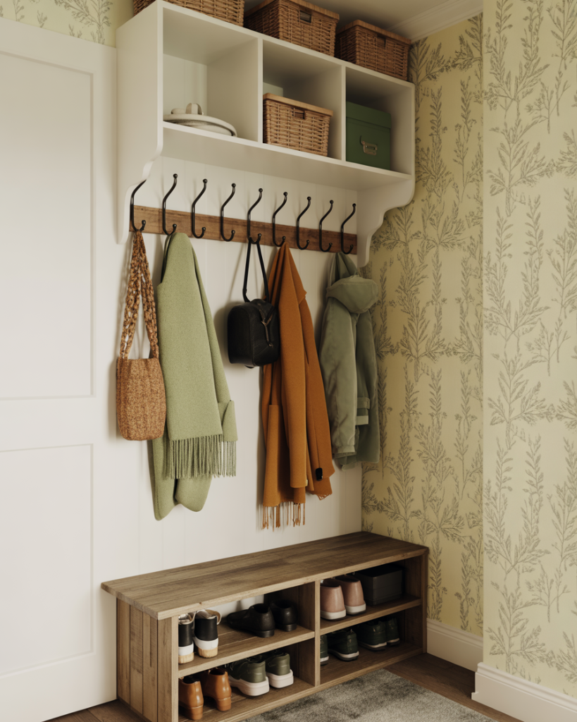 A small corner near your entryway can easily become a compact mudroom. Use Ikea cube shelves, a short bench, and patterned wallpaper to create visual appeal. This is an ideal DIY project for tiny spaces or apartments, proving that you don’t need a large footprint for a functional and stylish zone.