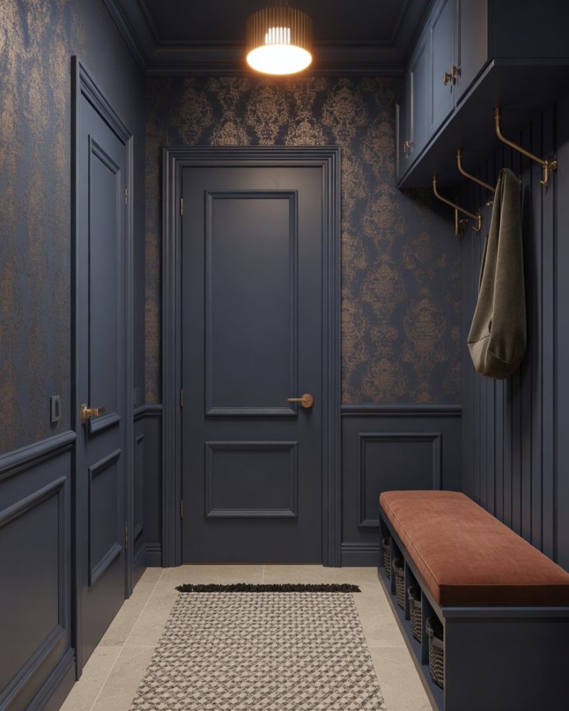 A moody mudroom uses rich tones and luxurious textures for dramatic flair. Deep navy or charcoal wallpaper, brass hooks, and soft velvet seating give it a bold, modern entryway aesthetic. This design is perfect for those who love a striking entryway that feels both elegant and intimate.