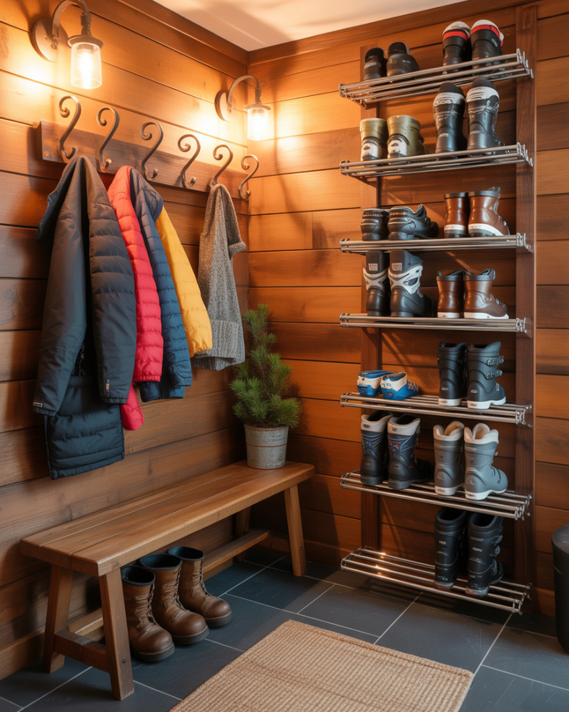 Bring cozy mountain vibes home with a ski-inspired mudroom. Think weatherproof flooring, heavy-duty hooks, and a rustic wooden bench. Heated boot racks make this idea both modern and practical for winter getaways or cabins. It’s a great way to capture lodge comfort even in suburban homes.