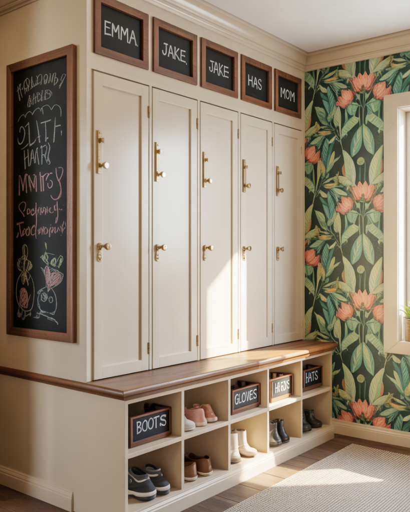 A large family needs a mudroom that keeps everyone organized. Custom lockers, labeled cubbies, and entryway cabinets help manage the mess. Use bright wallpaper or chalkboard panels for personality. This lively entryway idea keeps things fun and tidy, perfect for busy mornings and after-school routines.