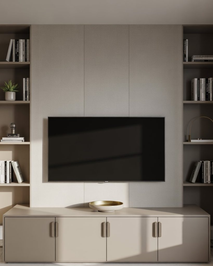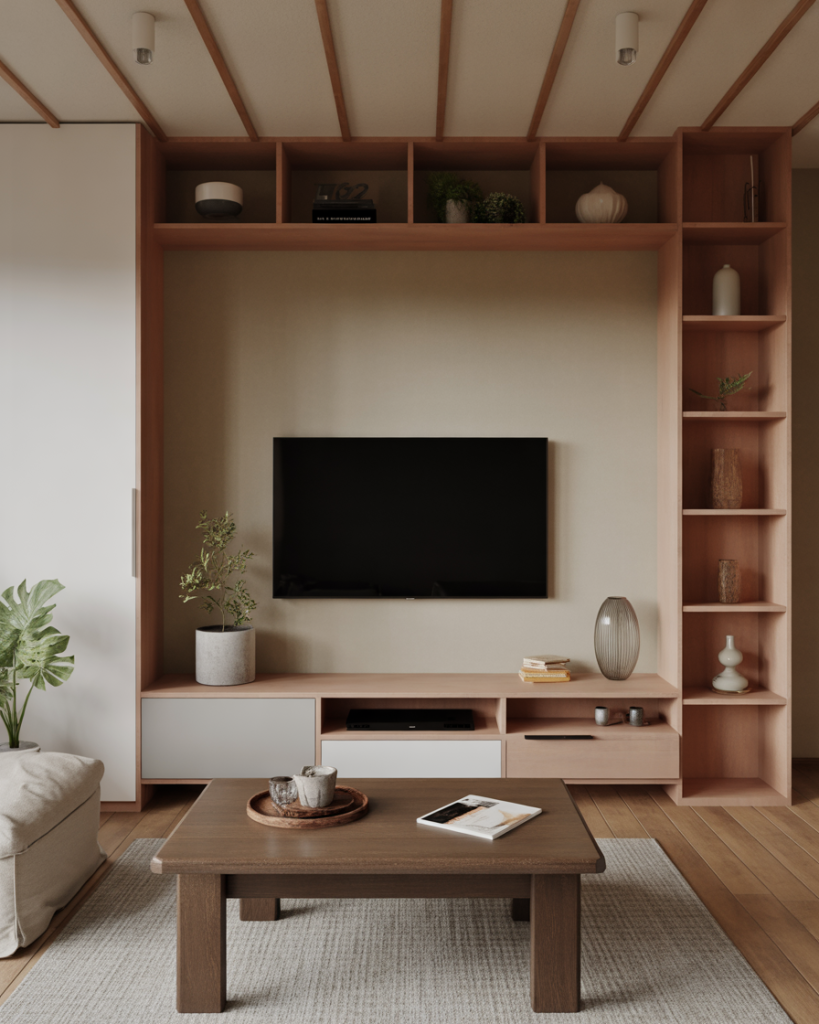 Japandi offers Japanese minimalism with Scandinavian cosiness and is going strong into 2026. The TV wall embraces balance through muted tones, matte finishes, and natural woods. Ideal for small spaces or apartments, Japandi is all about utility with serene aesthetics. Going for mount tv interior design solutions retains the flow, and having open shelving retains an uncluttered grounded feel.