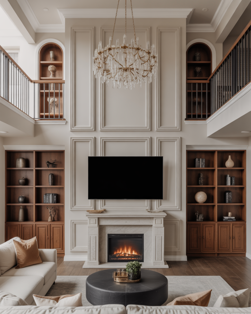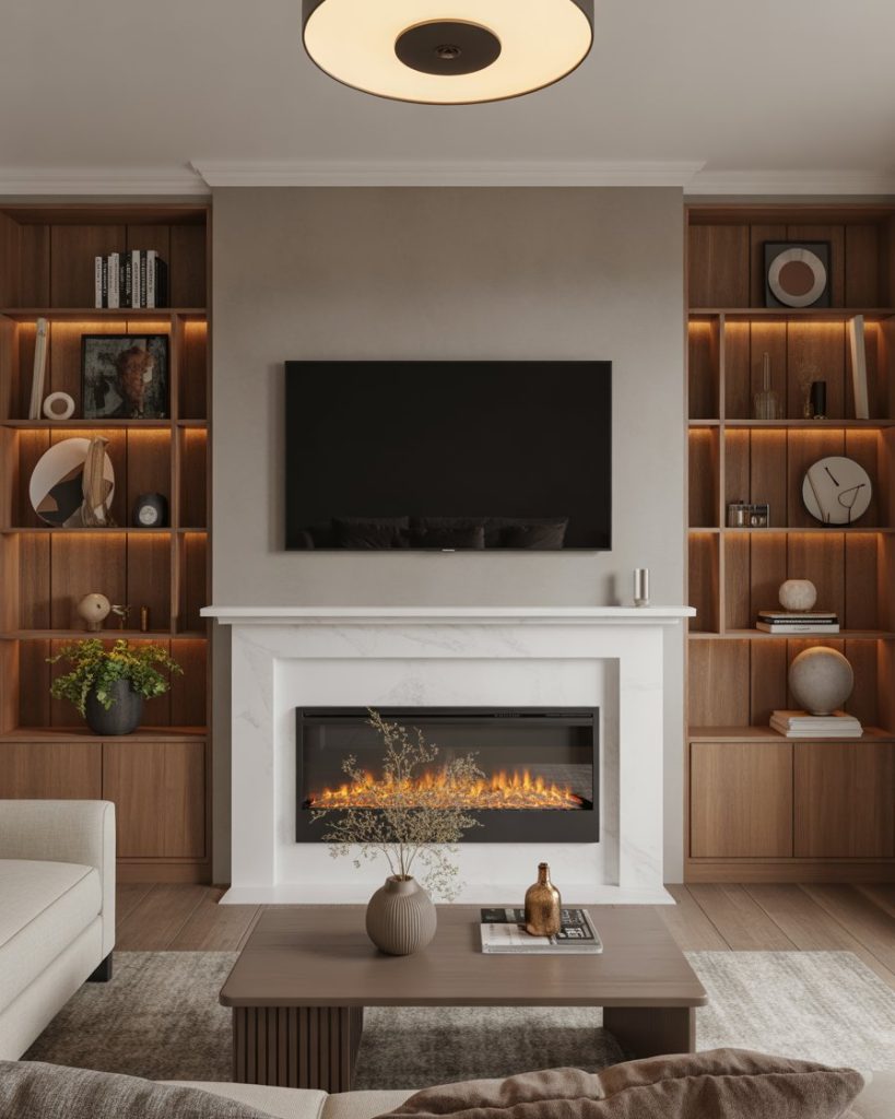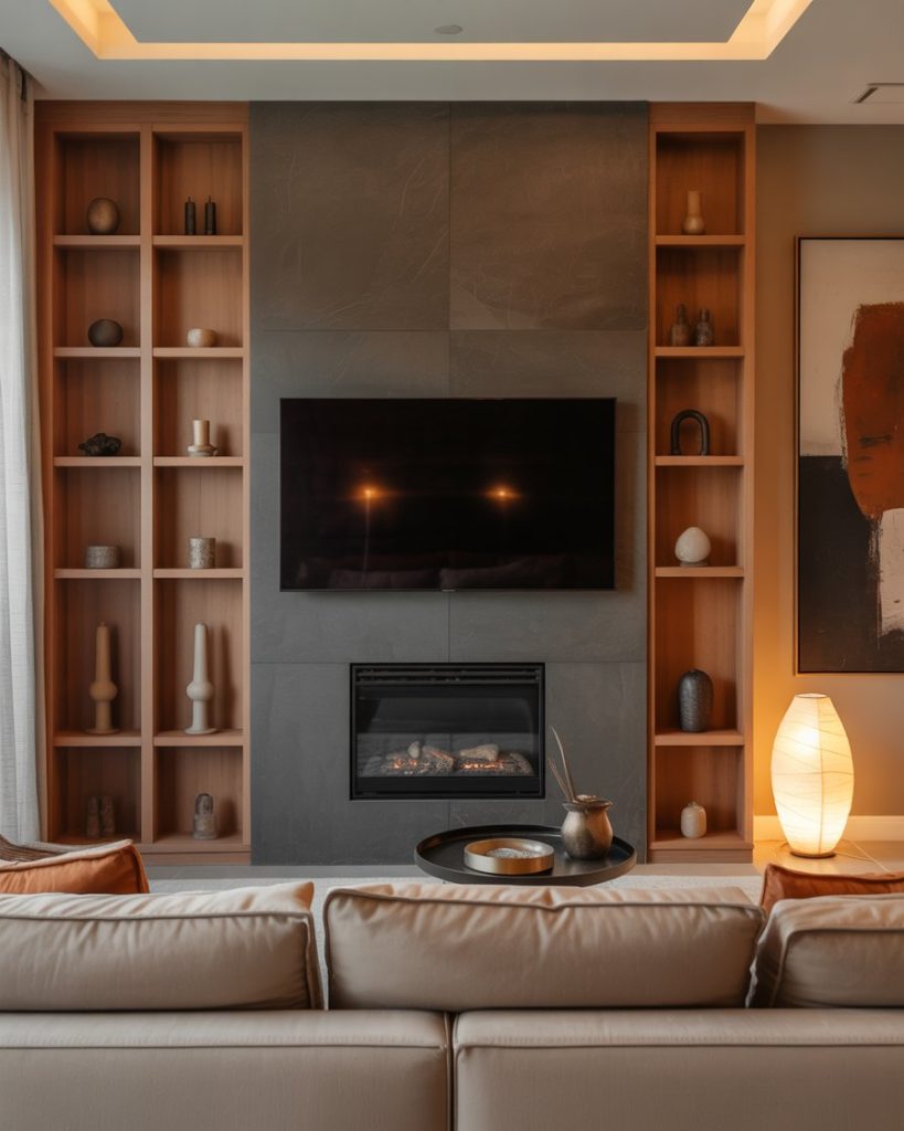 Combining the fireplace with your TV wall is suggesting that this would be perennial. In modern luxury homes, fireplace built-ins or DIY fireplace options generate warmth and stun glances. It could be either a 2-story living room or a small apartment. Pairing fire with the screen adds atmosphere and function. As noted by Emily Henderson and many others, this pair grounds the space, creating visual appeal that feels cocooning in nature.