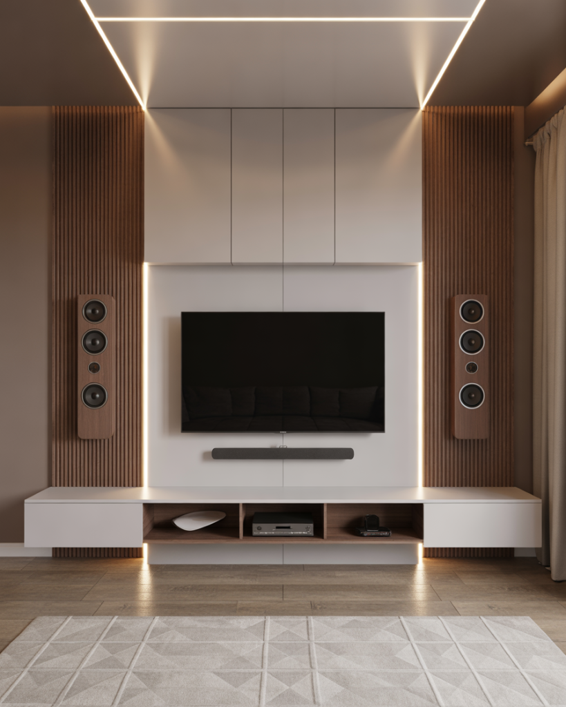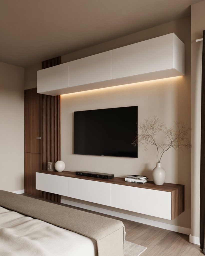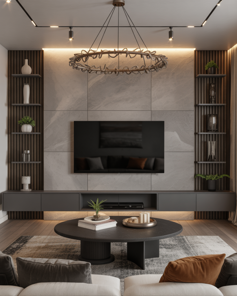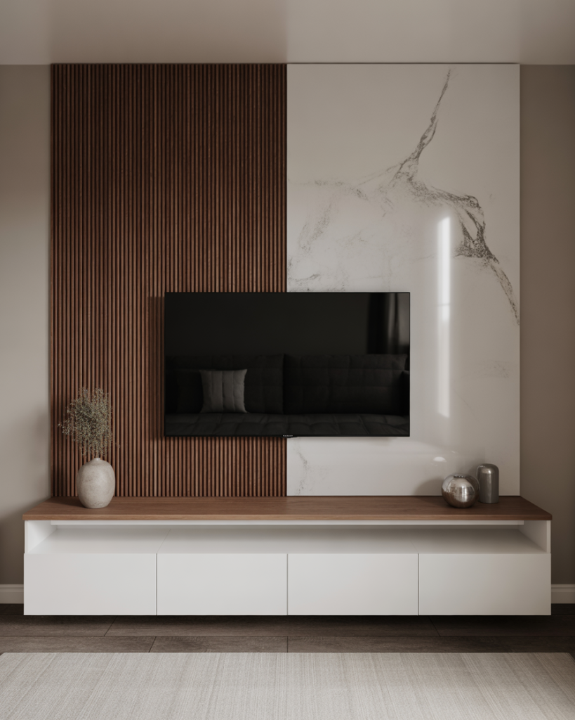 A modern two-tone TV wall employs contrast between two materials, such as wood and marble or light and dark paint, to bring out the TV area. The feeling is dramatic yet simple, which makes it an easy adaptation for small apartments interior design and large homes alike. It draws attention to itself while remaining balanced, becoming a sophisticated center without being further complicated.