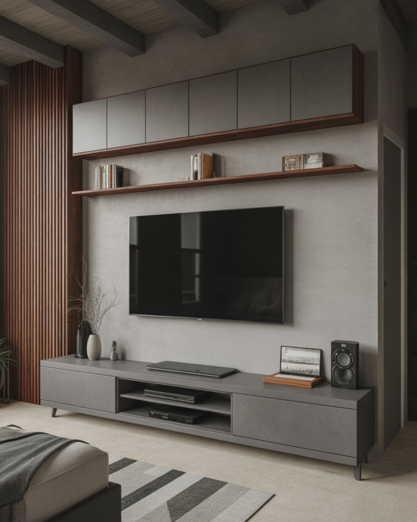 Concrete cuts an industrial yet modern luxury vibe to that TV wall. Textured or polished concrete finish makes even small space bold and dramatic. Pair with slim mount tv interior design solutions for seamless perfection. This style connects with urban lofts but also bends for suburban homes willing for a touch of industrial chic- raw material meets contemporary sophistication.