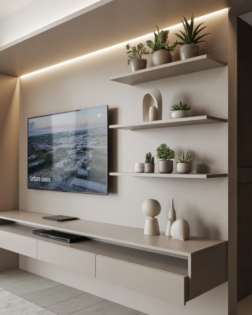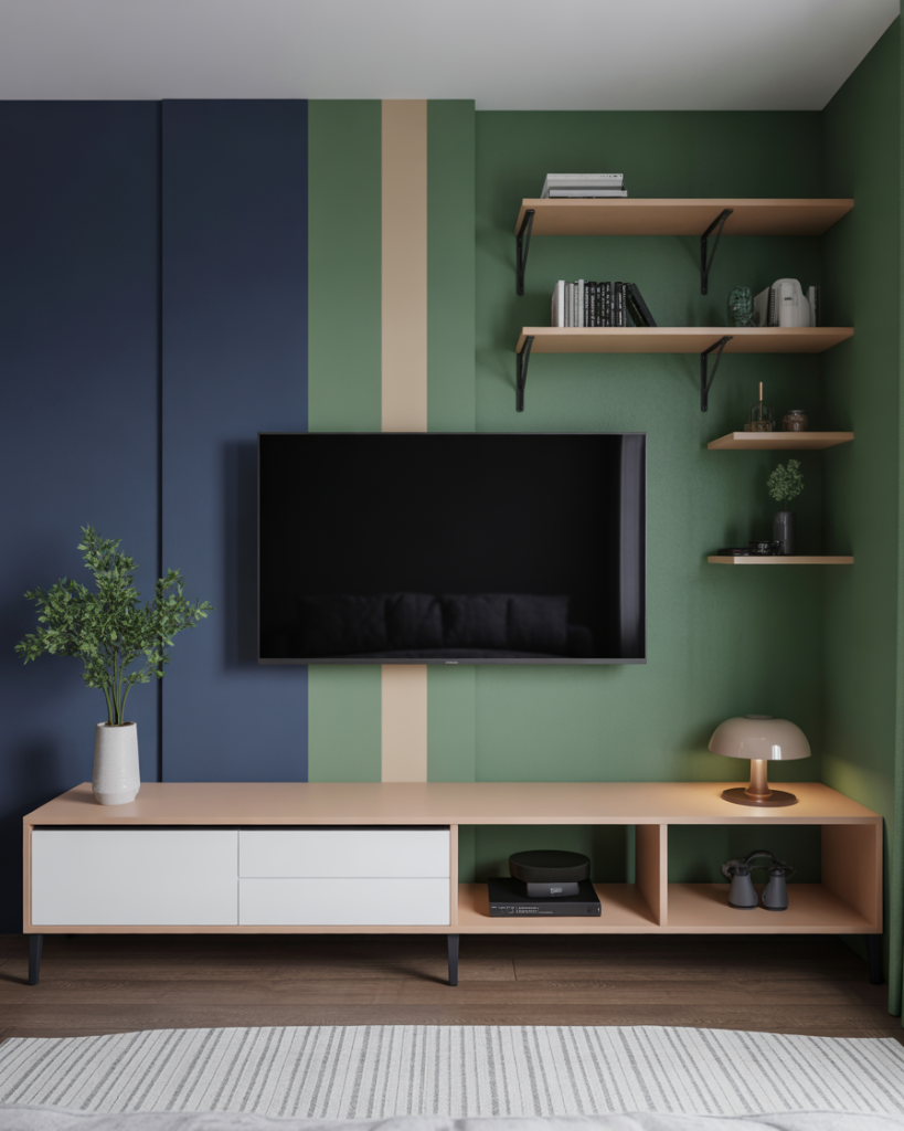 Neutrals would have it; yet, pronounced hues are in for 2026. A TV wall drenched in deep green, navy, or terracotta becomes the lip-smacking focal point. Even in small apartments interior design, the modern idea adds a nice dose of vibrancy without clutter. Pairing the wall with Ikea storage or a DIY shelving unit brings a perfect counterbalance of color and pragmatism, dripping with fun personality and assuredness in design.