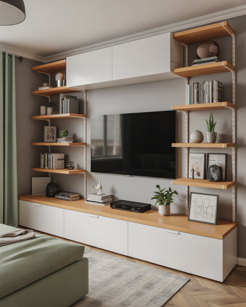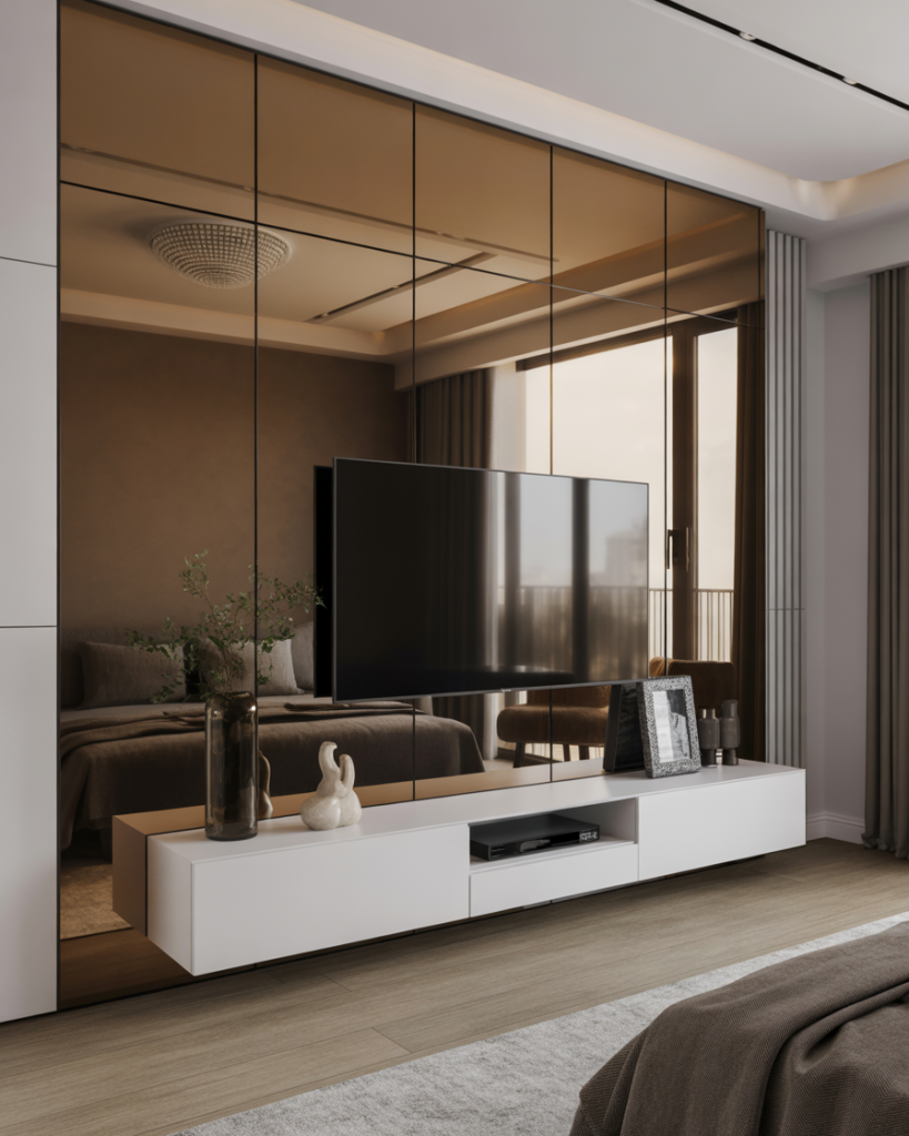 Glass or mirror panels behind the TV wall create depth and elegance. This modern simple luxury way works best for small apartments in uplifted décor, for reflection expands space visually. When paired with subtle shelves or Ikea solutions, the reflective wall provides glitz and function without putting the room into shade.
